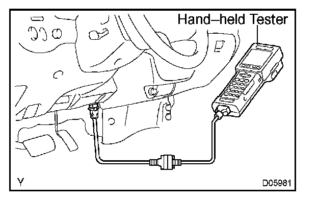 9. After simulating the malfunction conditions, use the hand-held tester diagnosis selector to check the DTCs, freeze frame data, and other data.