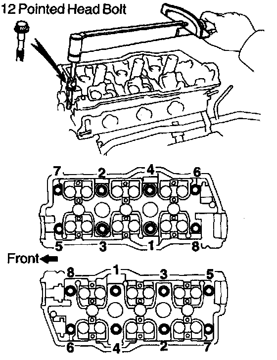 ^ The cylinder head bolts are tightened in 3 progressive steps (steps (2), (4) and (5)).
