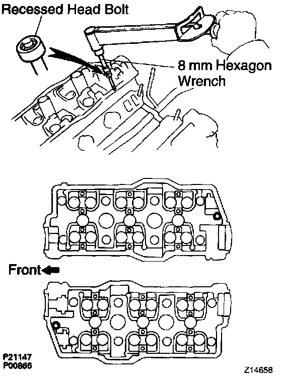 2. Using an 8 mm hexagon wrench, install the cylinder head bolt on each cylinder head, then repeat for the other side, as shown.