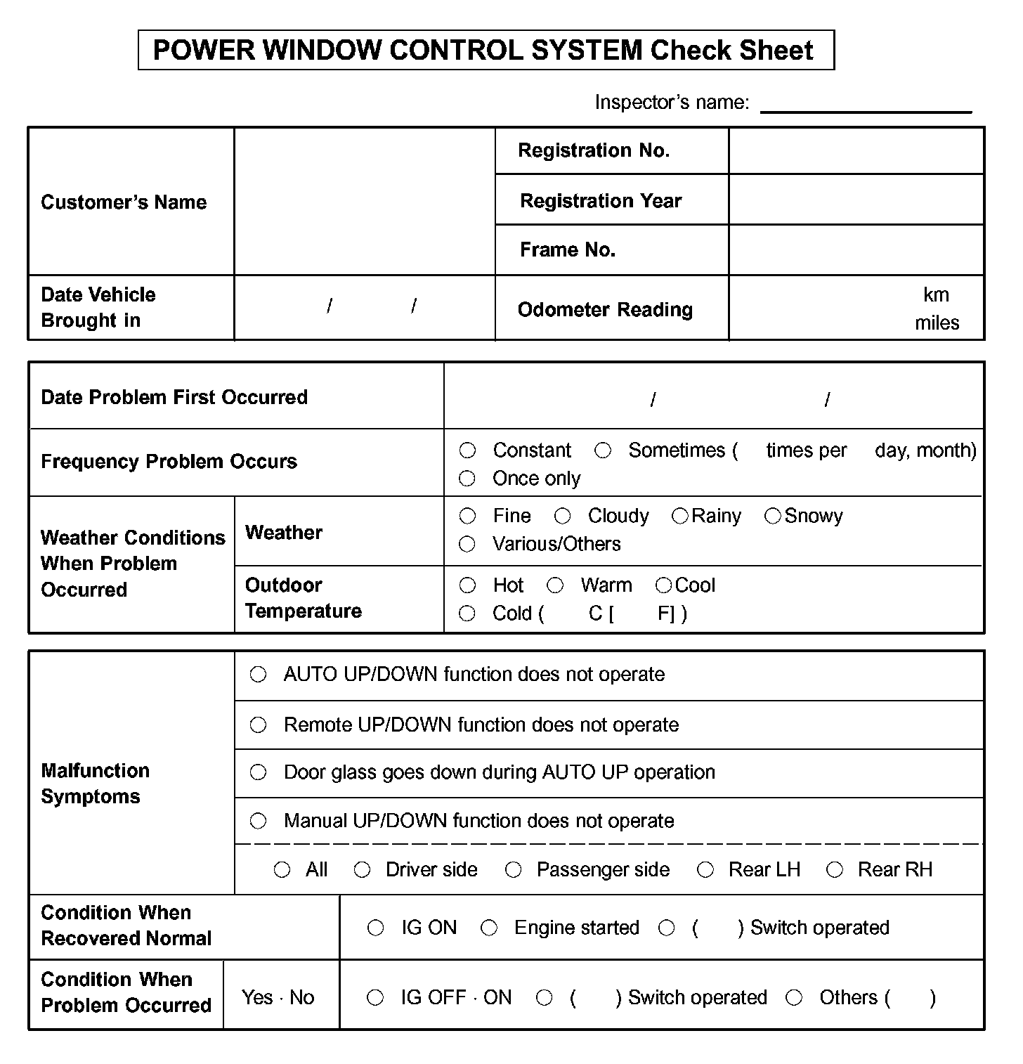 Power Window Control System Check Sheet: