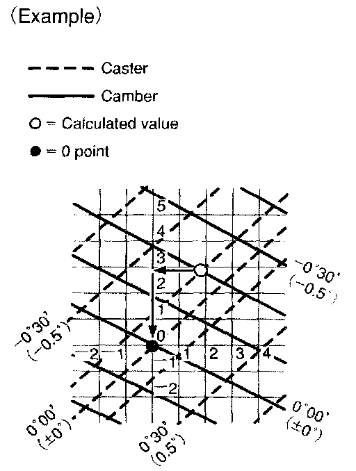 3. As shown in the chart, read the distance from the marked point to 0 point, and adjust the front and/or rear adjusting cams accordingly.