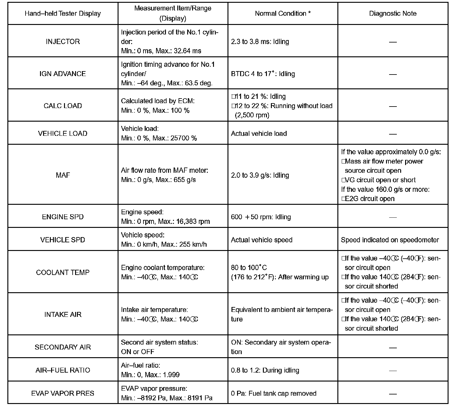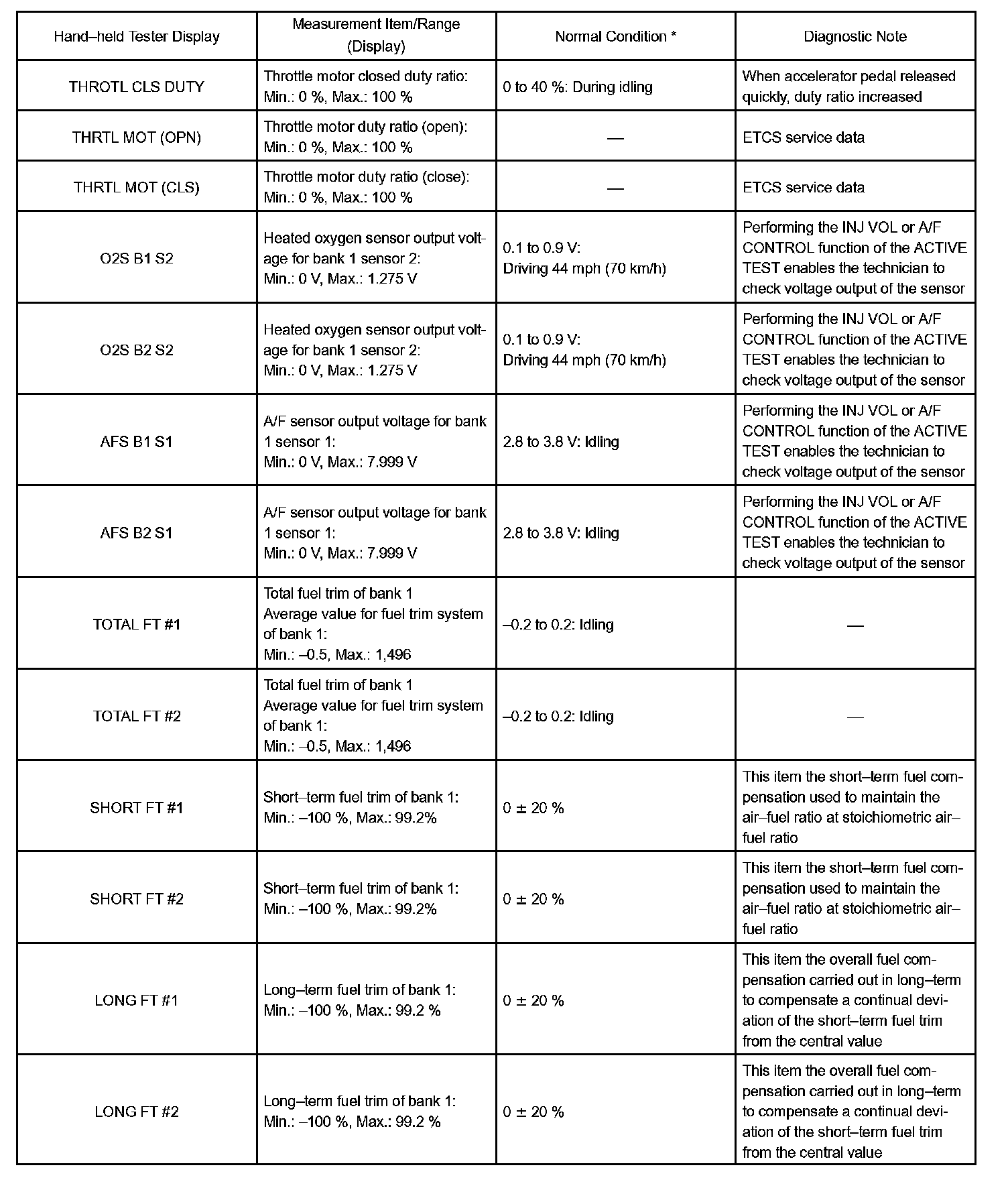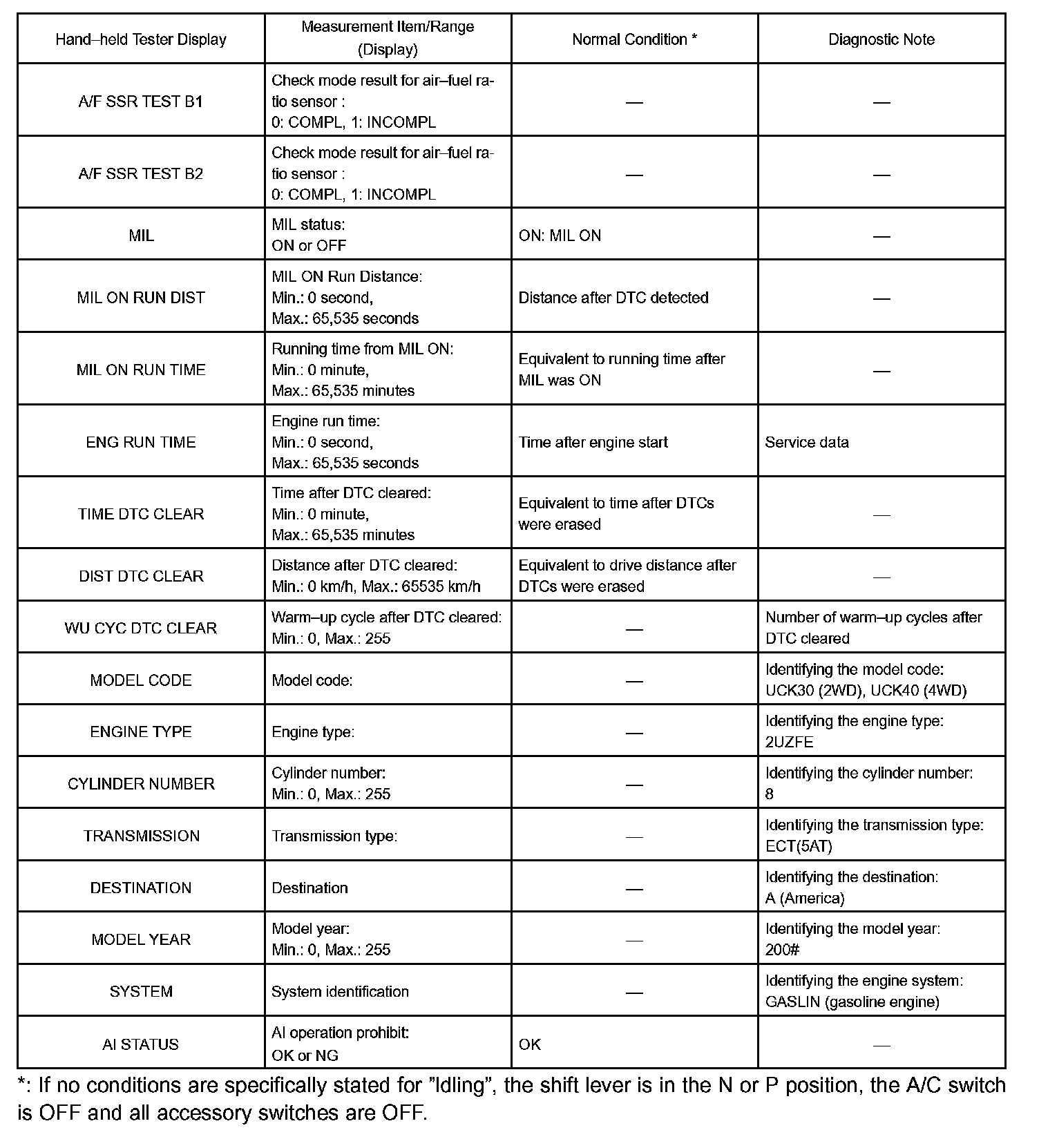 DATA LISTHINT: Using the hand-held tester, DATA LIST allows switch, sensor, actuator and other item values to be read without removing any parts. Reading DATA LIST early in troubleshooting is one way to shorten labor time.
