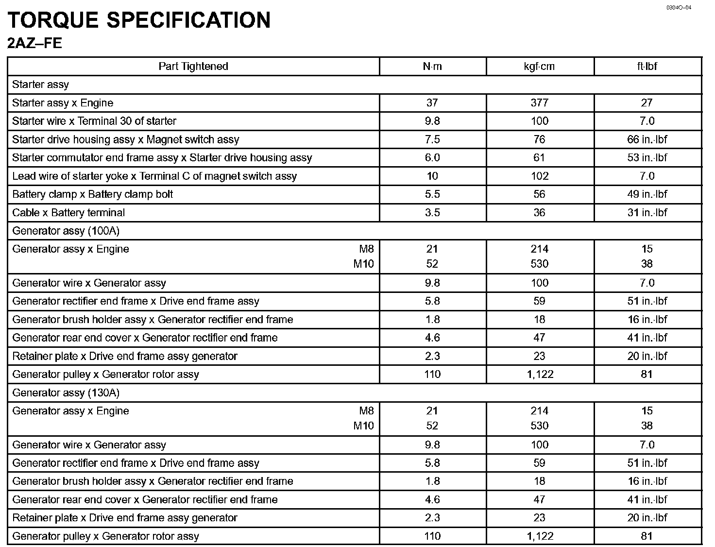 Starting & Charging - Torque Specification: