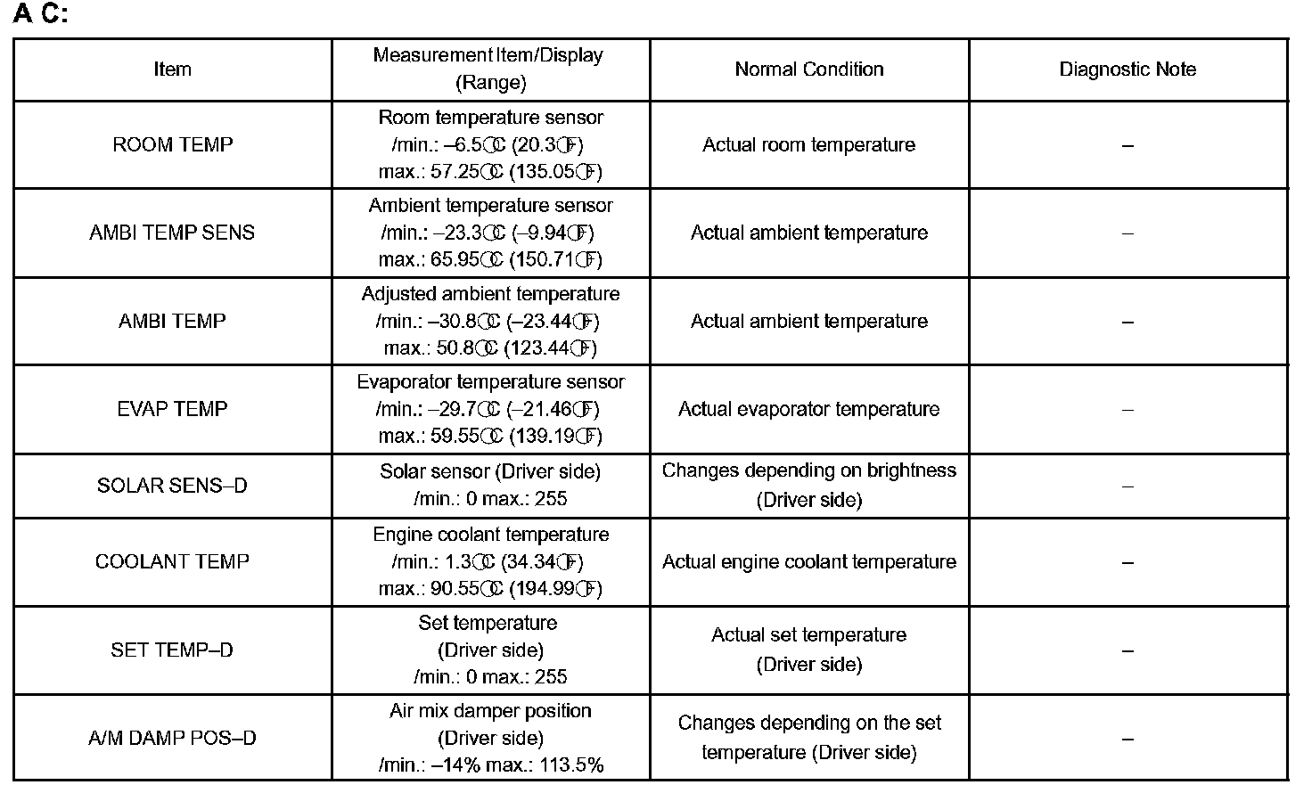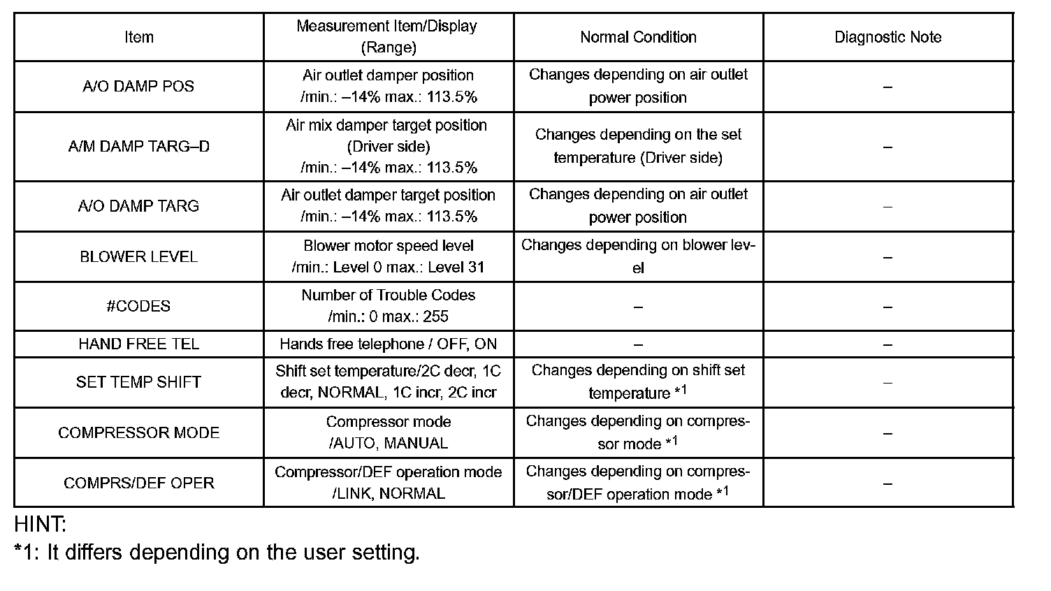 HINT: From the DATA LIST displayed on the hand-held tester, you can read the values of the displays, sensors, actuators and so on without parts removal. Reading the DATA LIST as the first step of troubleshooting is one way to shorten labor time.