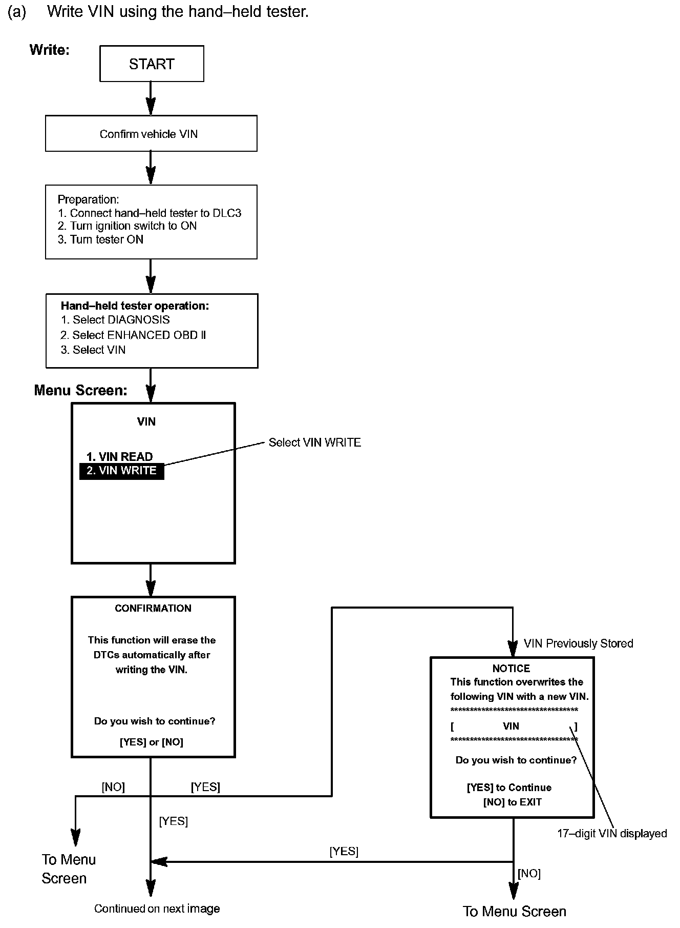 c. Write VIN: Explains the VIN writing process in a flowchart. This process allows the VIN to be input into the ECM. If the ECM is changed, or the VINs do not match, the VIN can be registered, or overwritten in the ECM by following this procedure.
