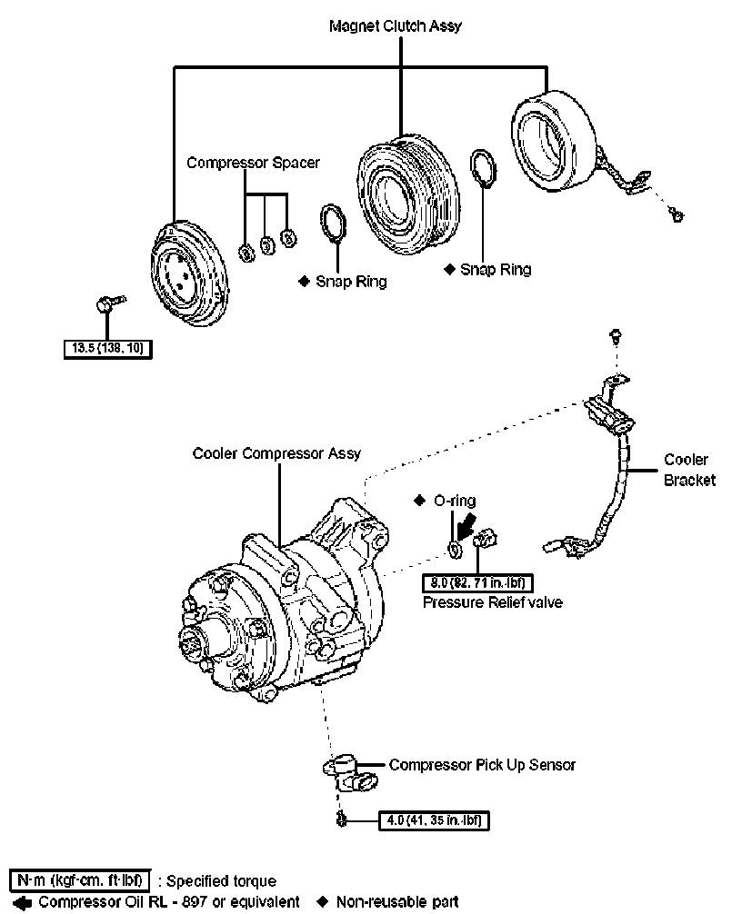 - If the volume of oil remaining in the removed compressor and magnetic clutch is too small, check for oil leakage.