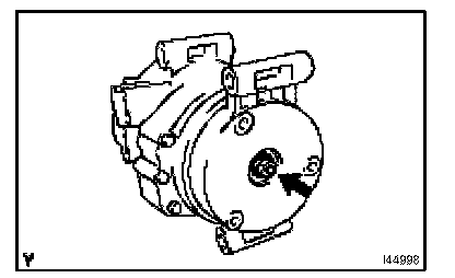 NOTE: Make sure that there is no foreign matter or oil on the compressor shaft, bolt, and clutch hub.