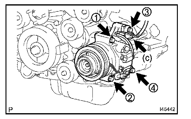 NOTE: Tighten the bolts in the sequence order shown in the illustration to install the compressor and magnetic clutch.