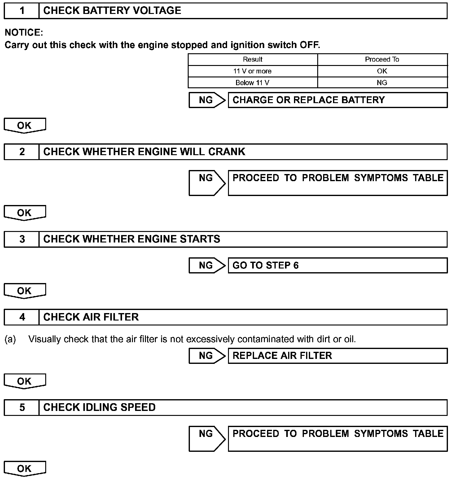When a malfunction is not confirmed by the DTC check, troubleshooting should be carried out in all circuits considered to be possible causes of the problem. In many cases, by carrying out the basic engine check shown in the flowchart, the location of the problem can be found quickly and efficiently. Therefore, using this check is essential when engine troubleshooting.