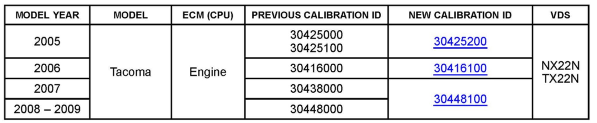 Some customers with 4 cylinder (2TR-FE) and A340 (4-speed) automatic transmission equipped Tacoma vehicles may experience an intermittent shudder or vibration. This condition lasts for approximately one second and occurs when lightly accelerating after an upshift into 3rd or 4th gear with the torque converter assembly in Flex Lockup. This vibration is commonly described as feeling like driving over "rumble strips" or on a "washboard" road. The Engine Control Module/ECM (SAE term: Powertrain Control Module/PCM) logic has been revised to prevent the learning of an incorrect value during certain driving conditions. Use the following repair procedure to address customer concerns.