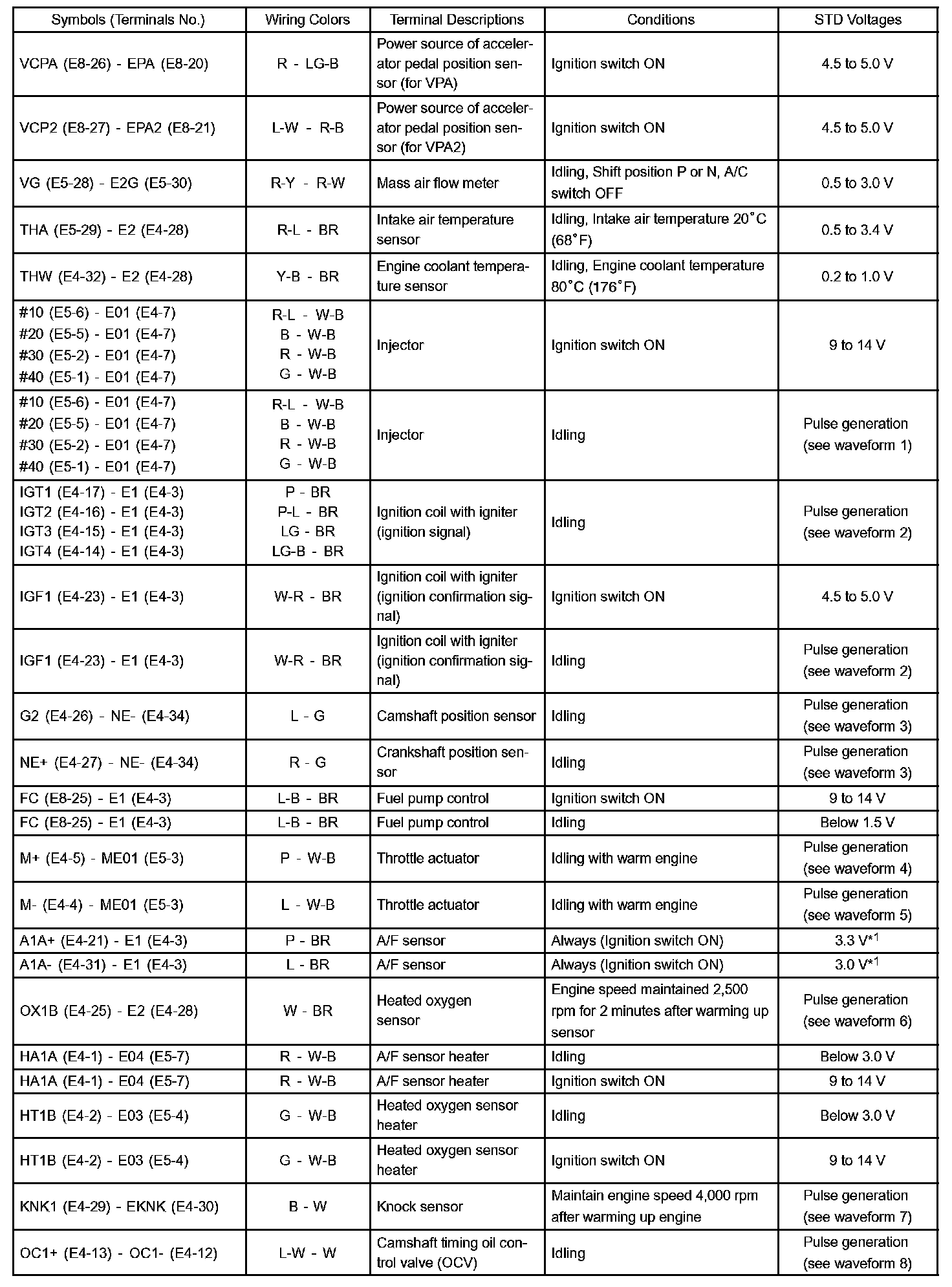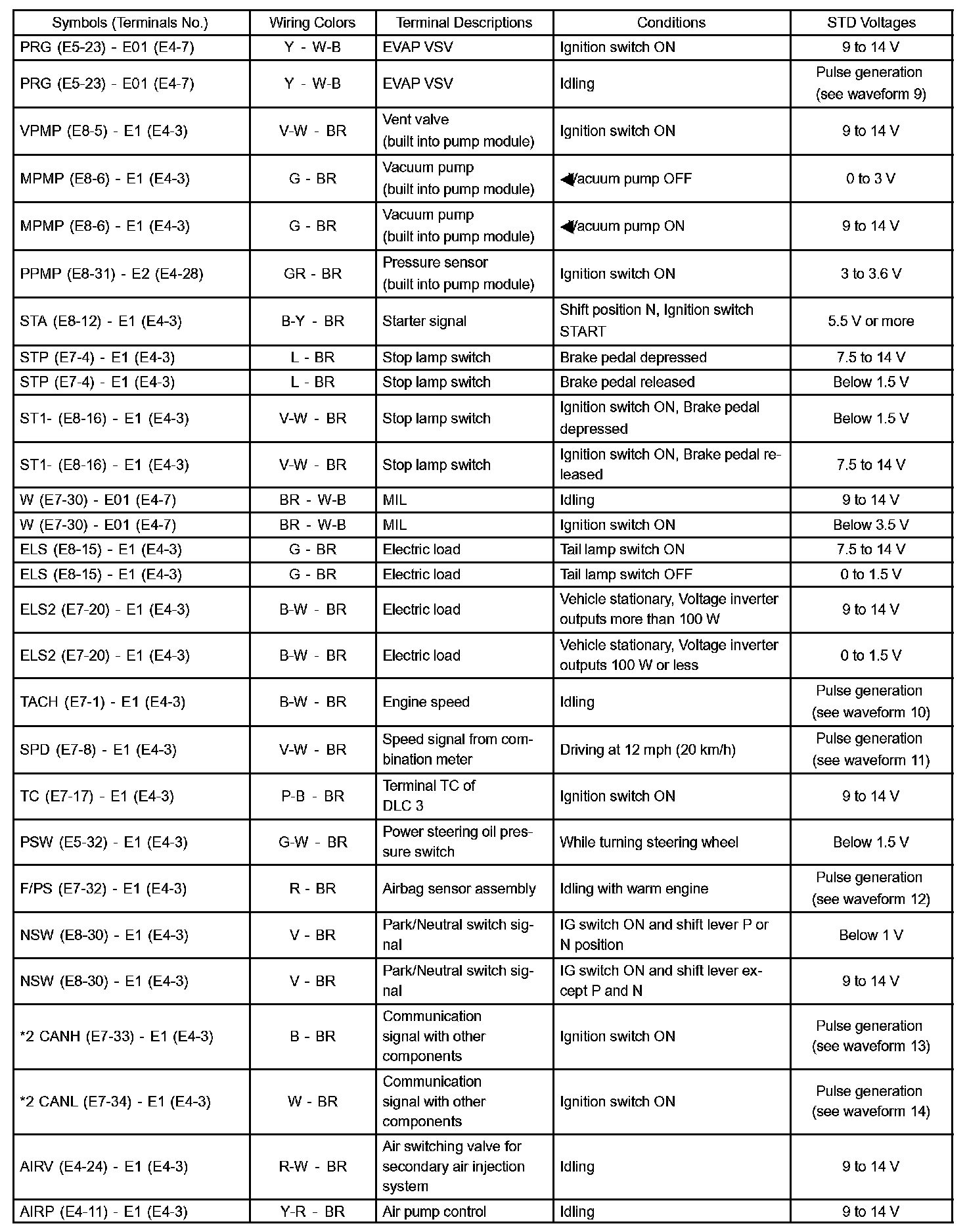 Pinout Values and Diagnostic Parameters