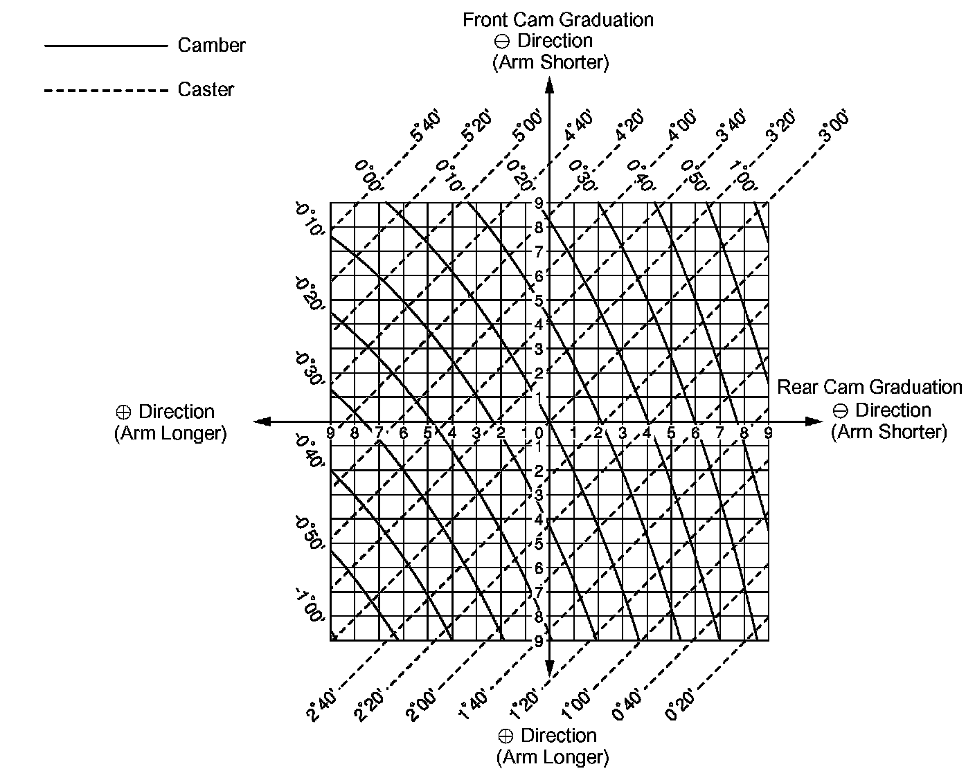 b. Adjust the camber and caster by front and/or rear adjusting cams (See adjustment chart).