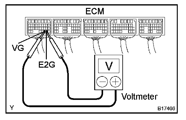 2. Connect the positive tester probe of the voltmeter to terminal VG of the ECM and the negative tester probe of the voltmeter to terminal E2G of the ECM.