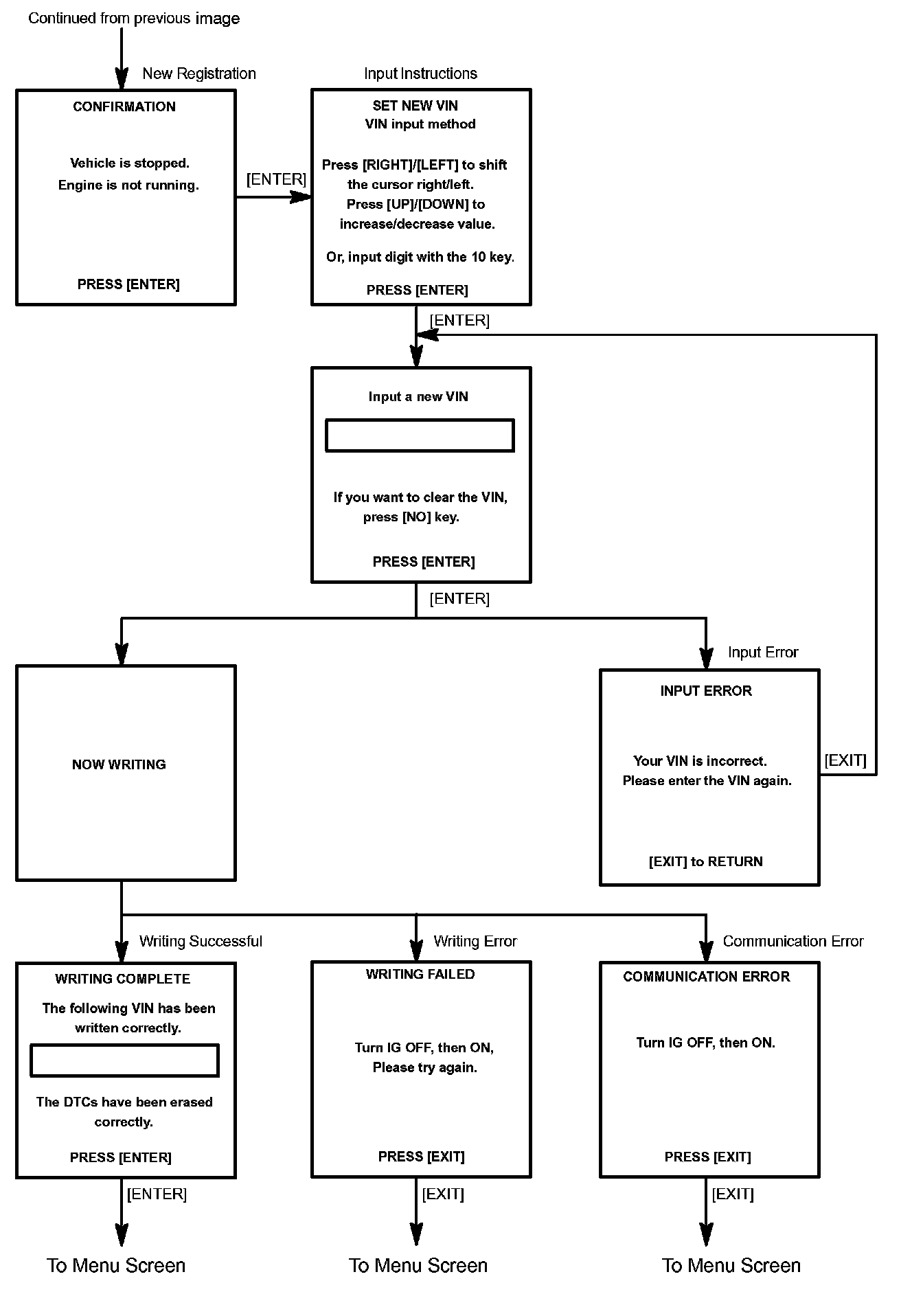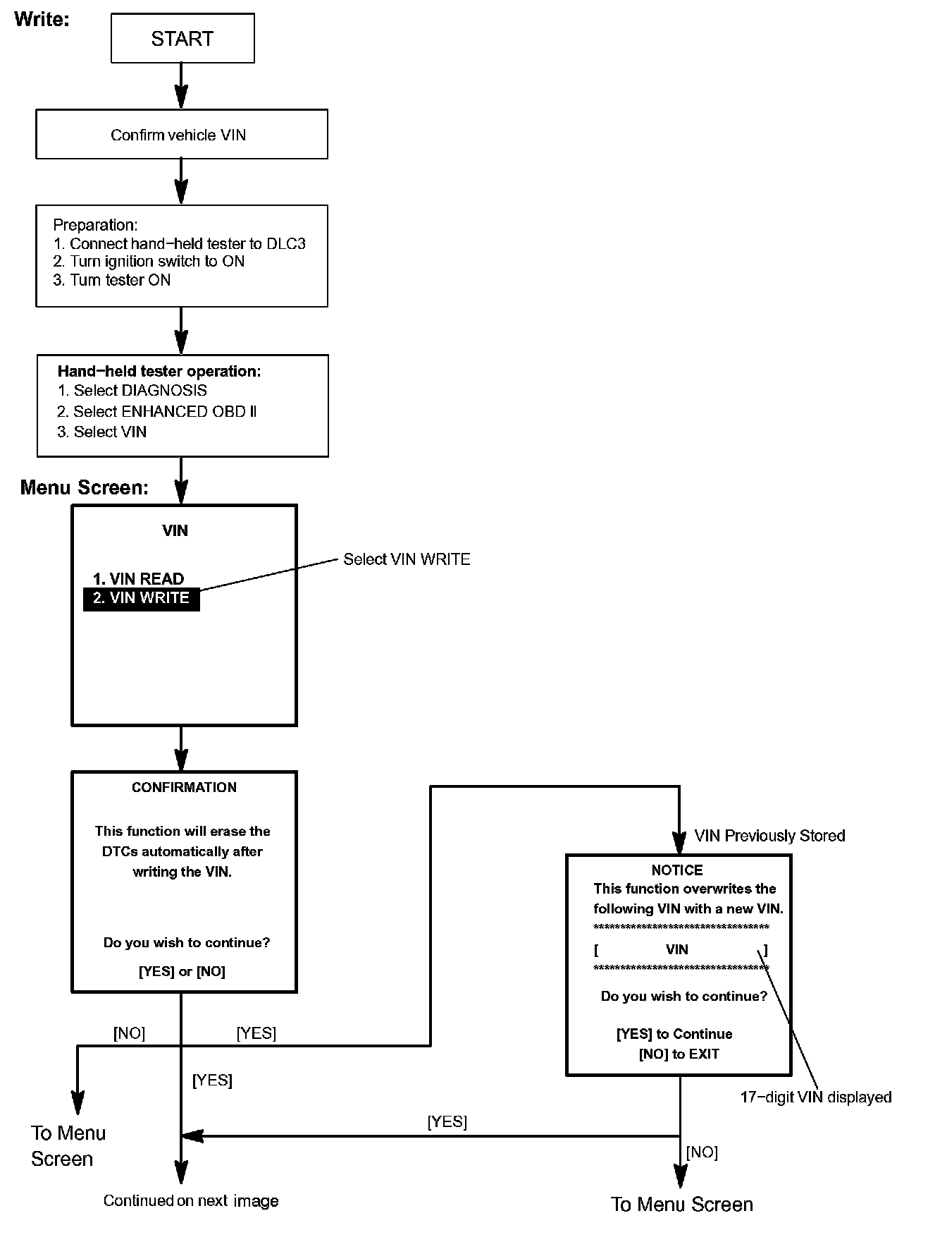 c. Write VIN: Explains the VIN writing process in a flowchart. This process allows the VIN to be input into the ECM. If the ECM is changed, or the VIN and VIN do not match, the VIN can be registered, or overwritten in the ECM by following this procedure.