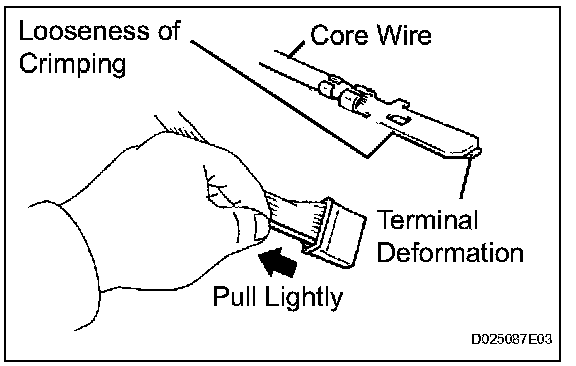 2. Checking when a connector is disconnected: Check by pulling the wire harness lightly from the backside of the connector. Look for unlatched terminals, missing terminals, loose crimps or broken conductor wires. Check visually for corrosion, metallic or foreign matter and water, and bent, rusted, overheated, contaminated, or deformed terminals.