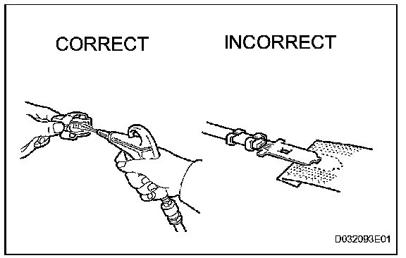 1. When disconnecting a connector, first squeeze the mating connector housing halves tightly together to release the lock, and then press the lock claw and separate the connector.
