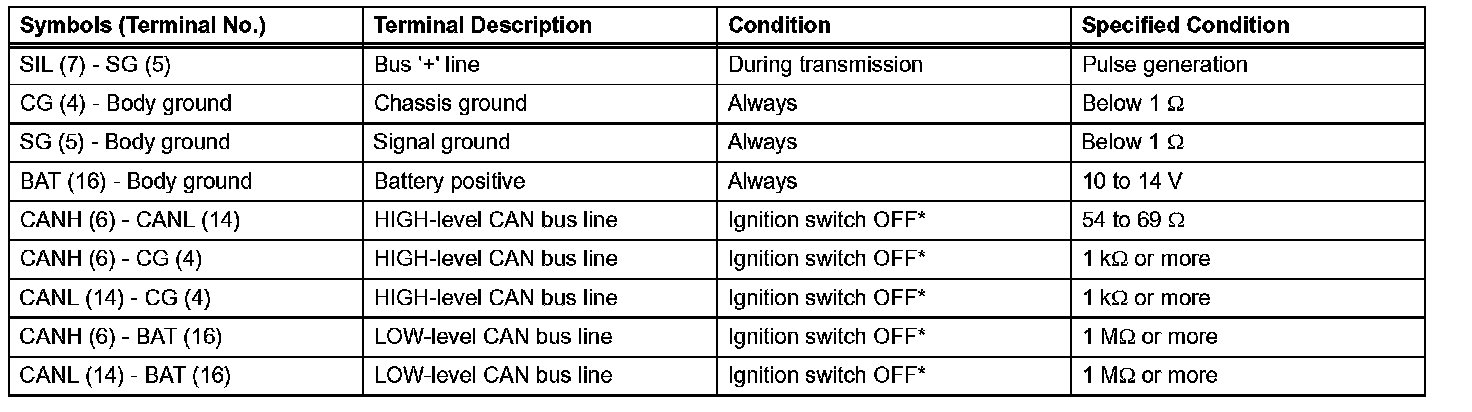 NOTE: *: Before measuring the resistance, leave the vehicle for at least 1 minute and do not operate the ignition switch, any switches or doors. If the result is not as specified, the DLC3 may have a malfunction. Repair or replace the harness and connector.