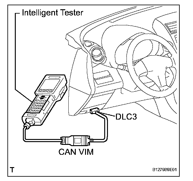 HINT: Connect the cable of the intelligent tester to the DLC3, turn the ignition switch ON and attempt to use the tester. If the display indicates that a communication error has occurred, there is a problem either with the vehicle or with the tester.