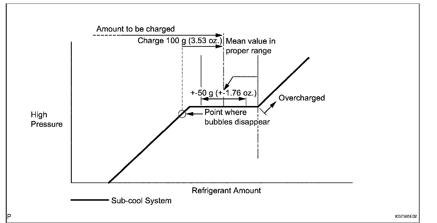 - Approximately 100 g (3.53 oz.) of refrigerant may need to be charged after bubbles disappear. The refrigerant amount should be checked by measuring its quantity, and not with the sight glass.