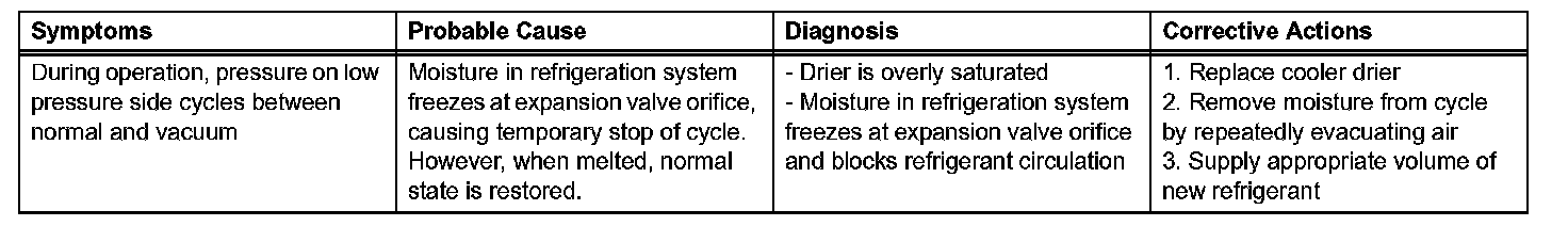 2. The A/C system periodically changes between normal and improper function due to moisture in the refrigerant system.