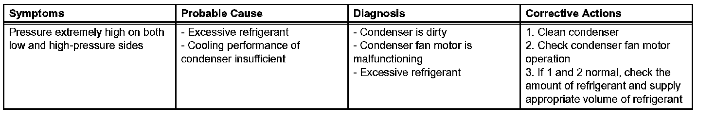 6. The A/C system does not function effectively due to overcharged refrigerant or insufficient cooling of the condenser.