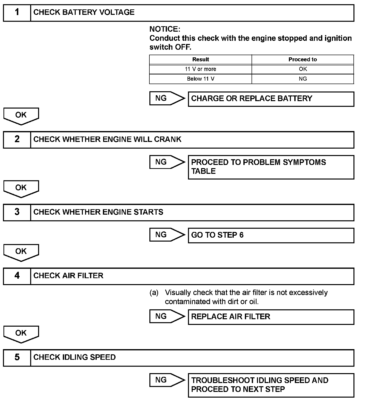 When a malfunction is not confirmed by the DTC check, troubleshooting should be carried out in all circuits considered to be possible causes of the problem. In many cases, by carrying out the basic engine check shown in the given flowchart, the location of the problem can be found quickly and efficiently. Therefore, using this check is essential when performing engine troubleshooting.