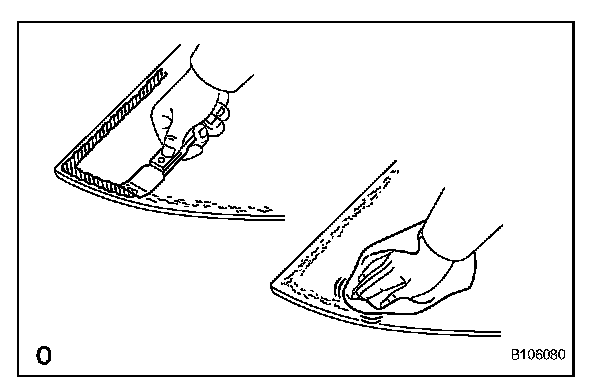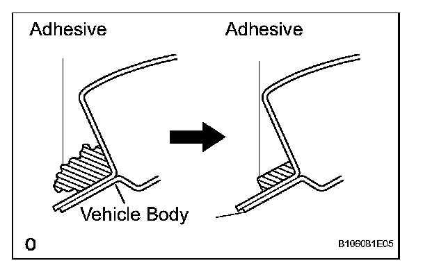 1. On the contact surface of the vehicle body, use a knife to cut away excess adhesive as shown in the illustration.