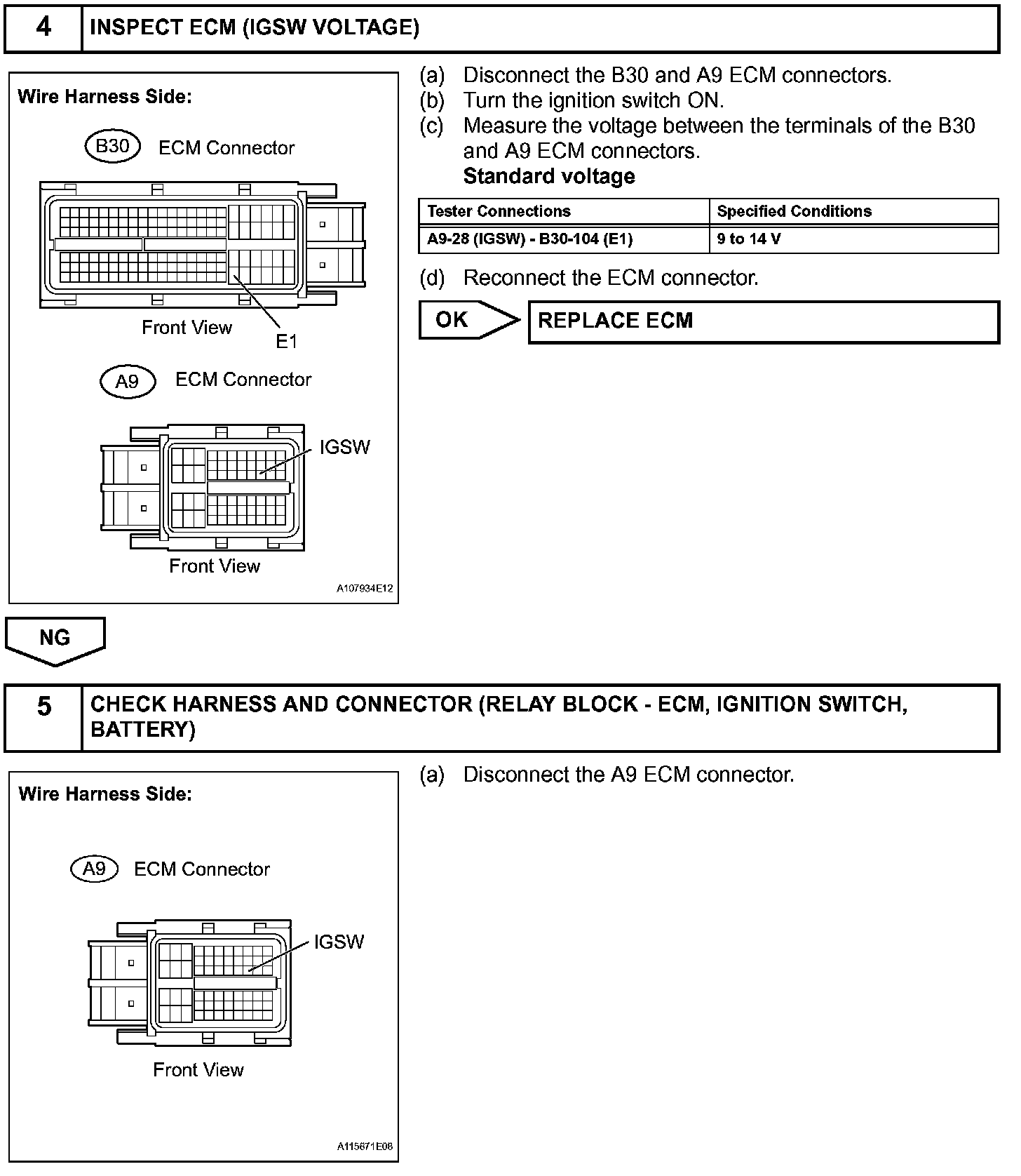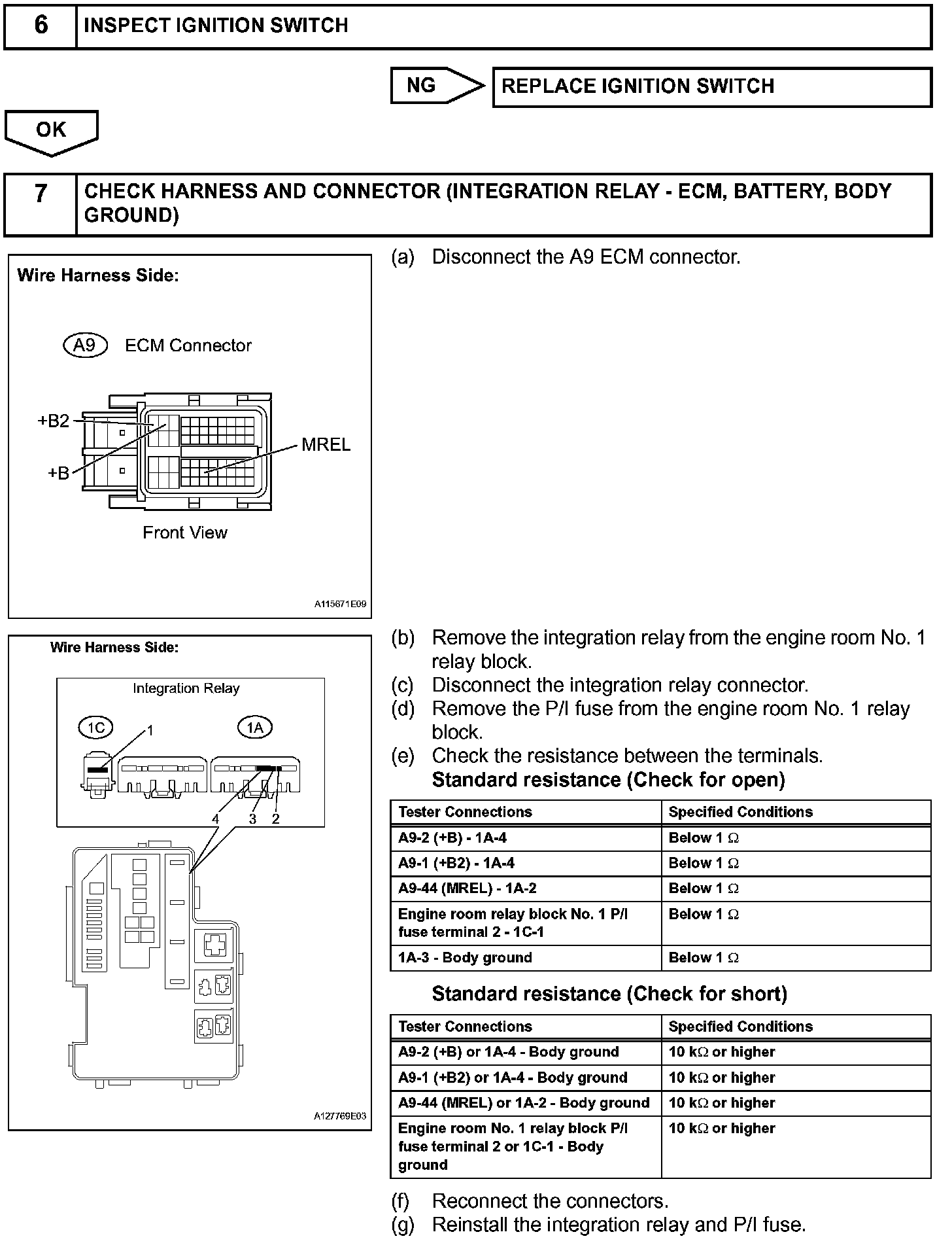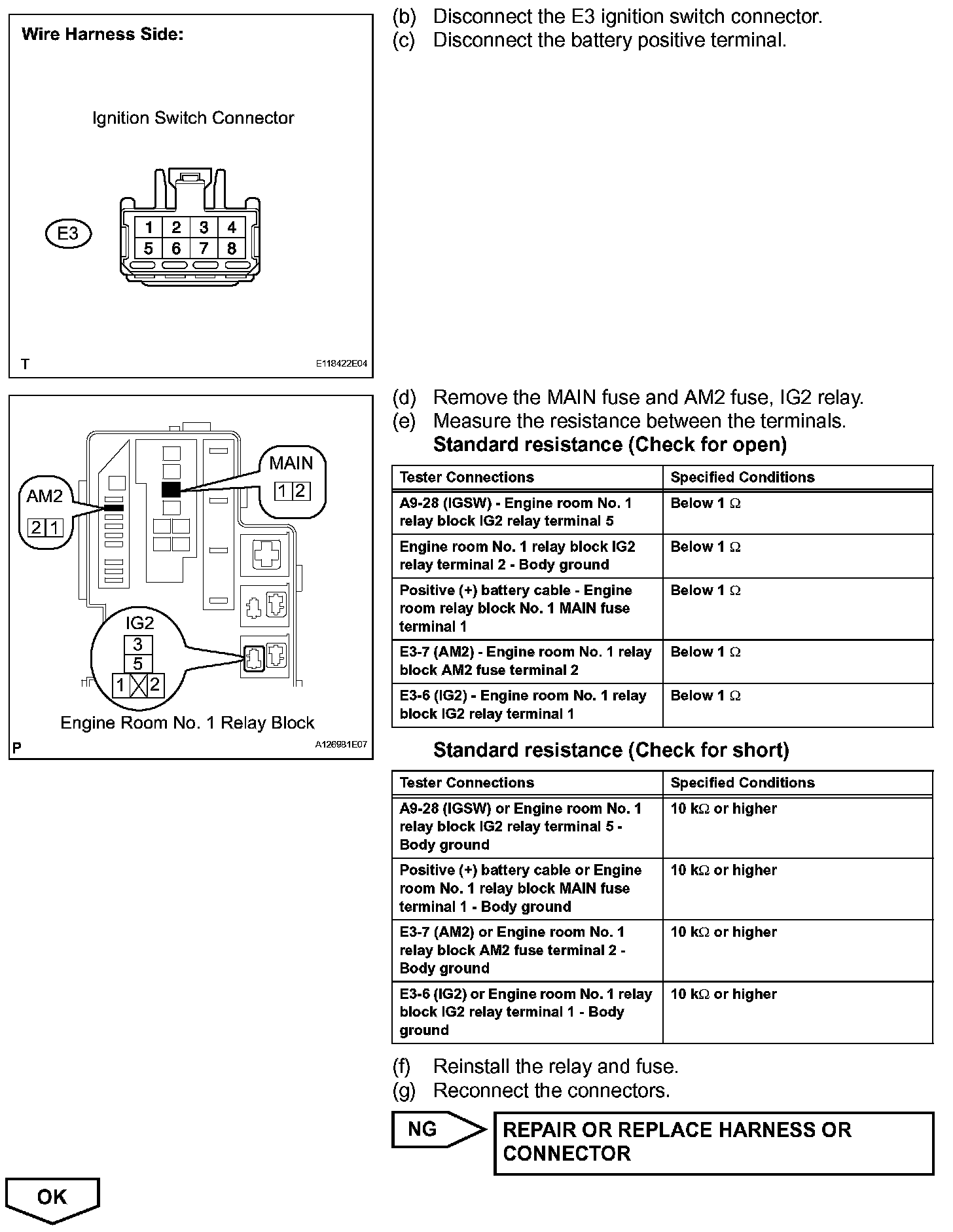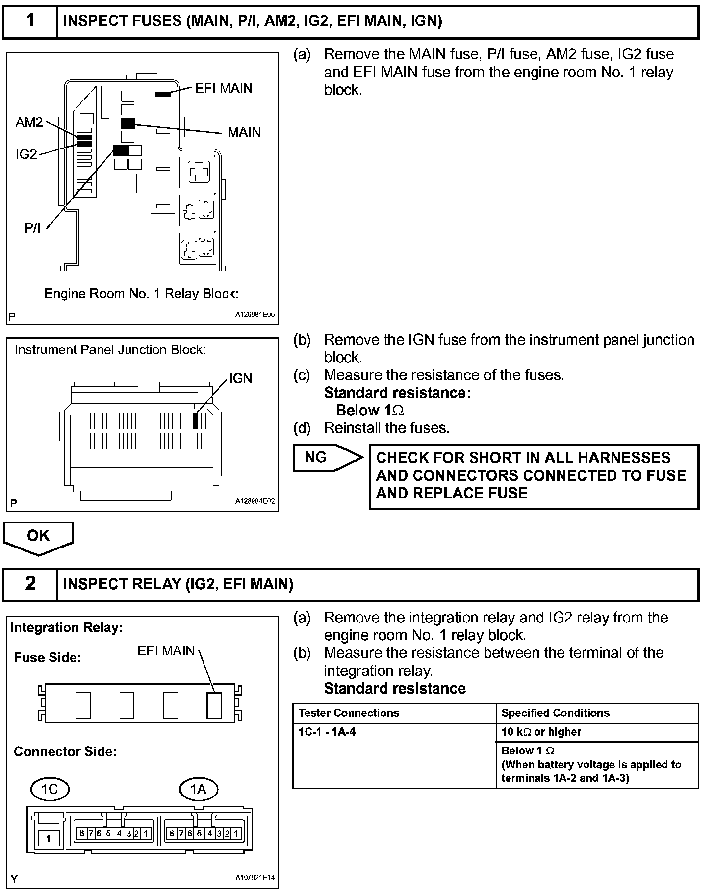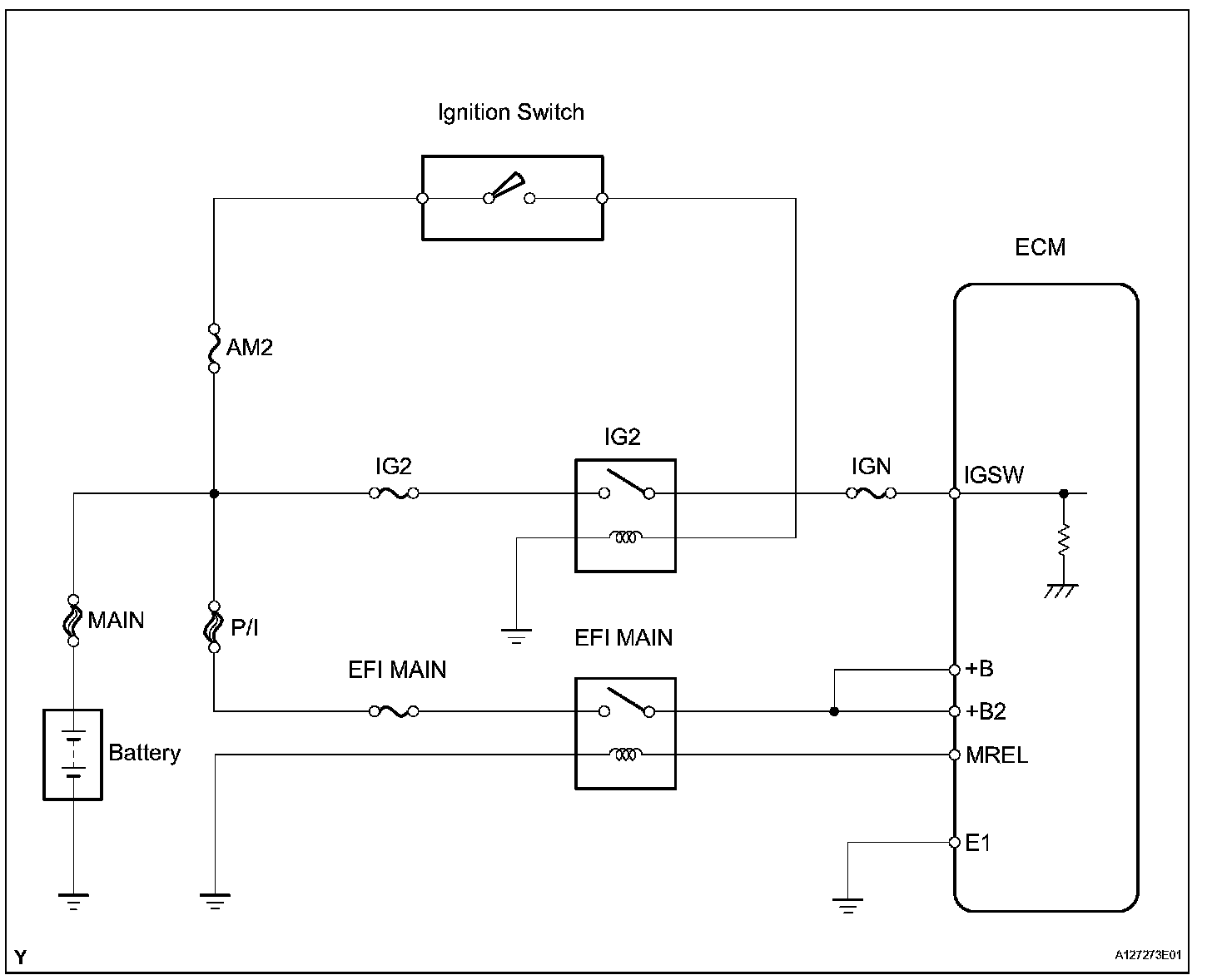 When the ignition switch is turned ON, the battery voltage is applied to the IGSW of the ECM. The output signal from the MREL terminal of the ECM causes a current to flow to the coil, closing the contacts of the integration relay (EFI MAIN relay) and supplying power to either terminal +B or +B2 of the ECM.