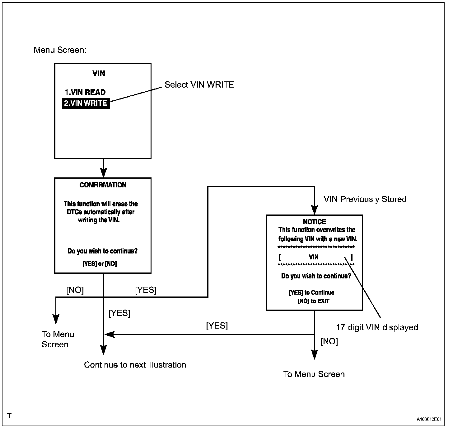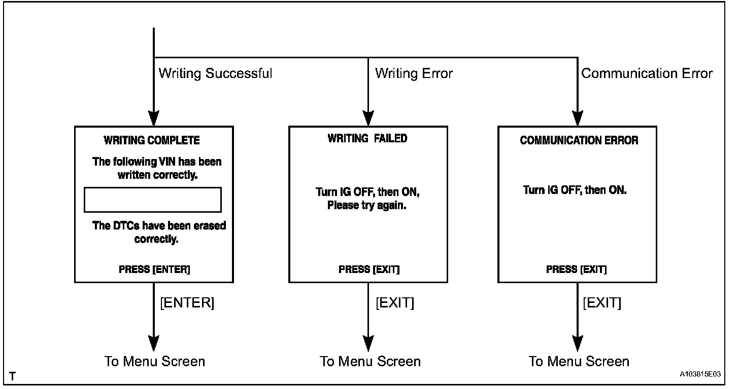 HINT: Below are the VIN writing instructions. Use the procedures and flowchart. This process allows the VIN to be input into the ECM. If the ECM is changed, or the ECM VIN and Vehicle VIN do not match, the VIN can be registered or overwritten in the ECM by following this procedure.