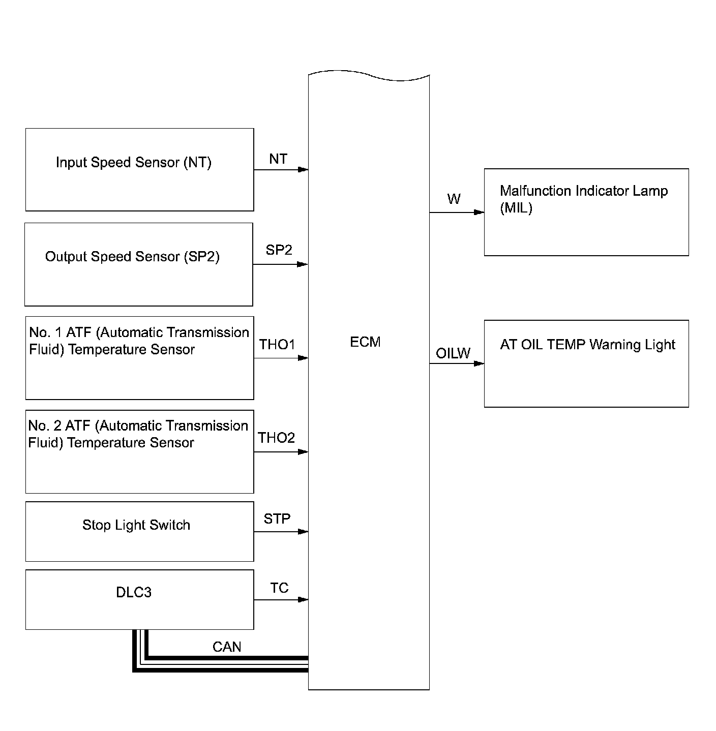 The configuration of the electronic control system in the A750E automatic transmission is as shown in the chart.