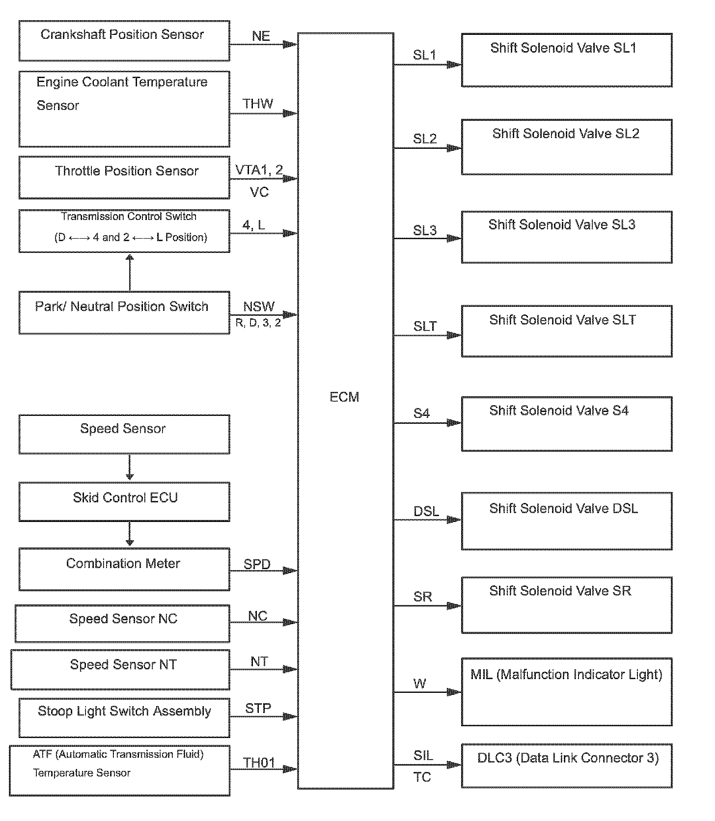 The configuration of the electronic control system in the U151E automatic transaxles is as shown in the chart.