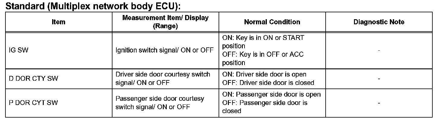 HINT: Using the DATA LIST displayed by the intelligent tester, you can read the values of the switch, sensor, actuator, etc.. without parts removal. Reading the DATA LIST as the first step of troubleshooting is one way to shorten the labor time.