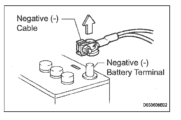 3. Clock settings, radio settings, audio system memory, DTCs and other data are erased when the cable is disconnected from the negative (-) battery terminal. Write down any necessary data before disconnecting the cable.