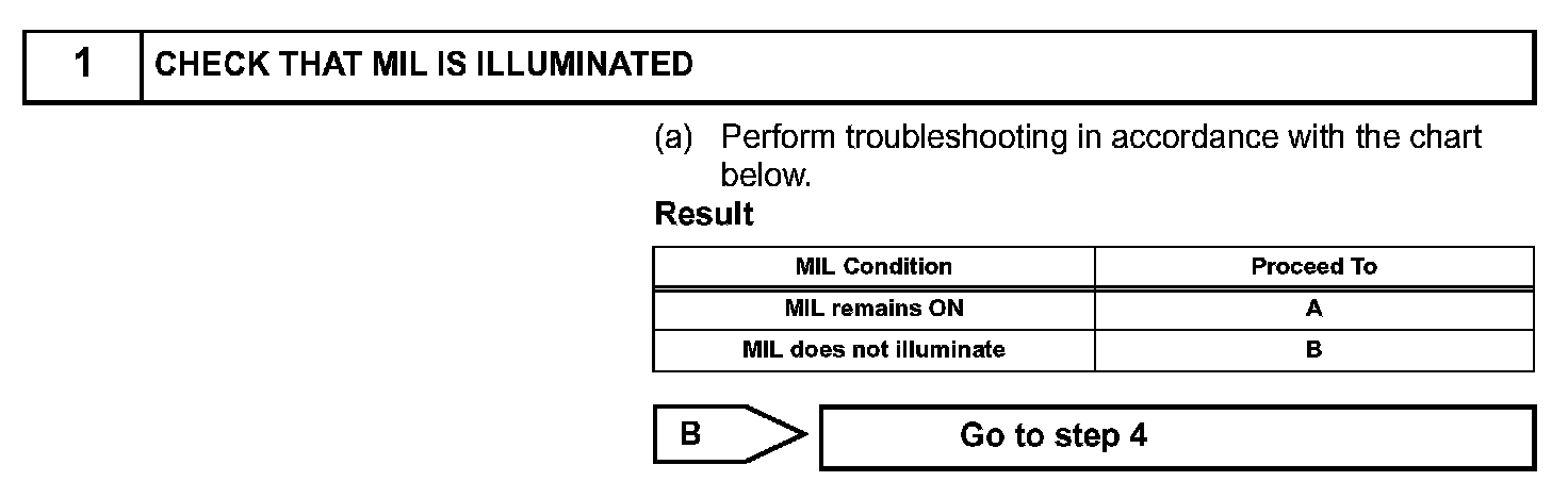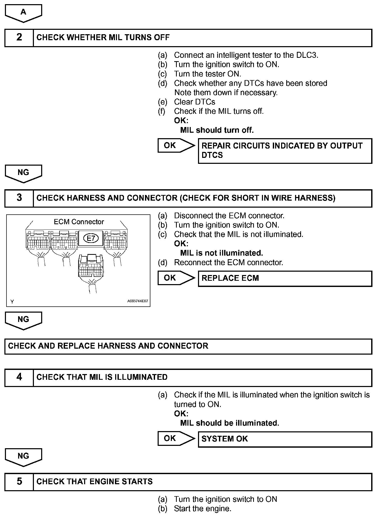 The MIL operation can be checked visually: When the ignition switch is first turned to ON, the MIL should be illuminated and should then turn OFF. If the MIL remains illuminated or is not illuminated, conduct the following troubleshooting procedure using an intelligent tester.