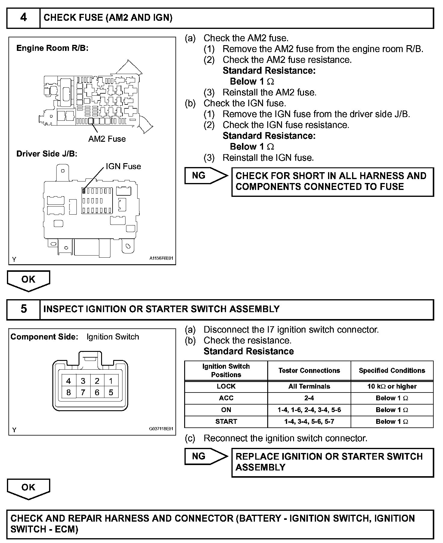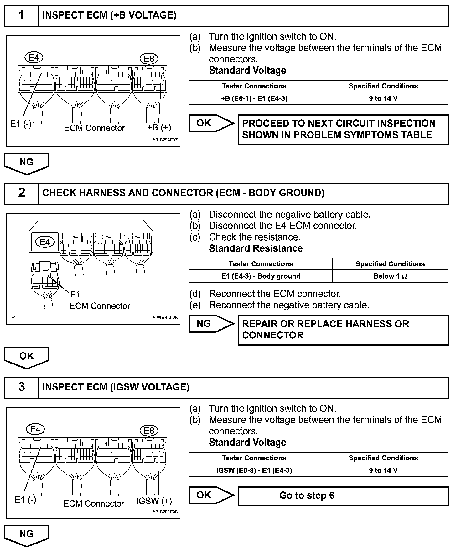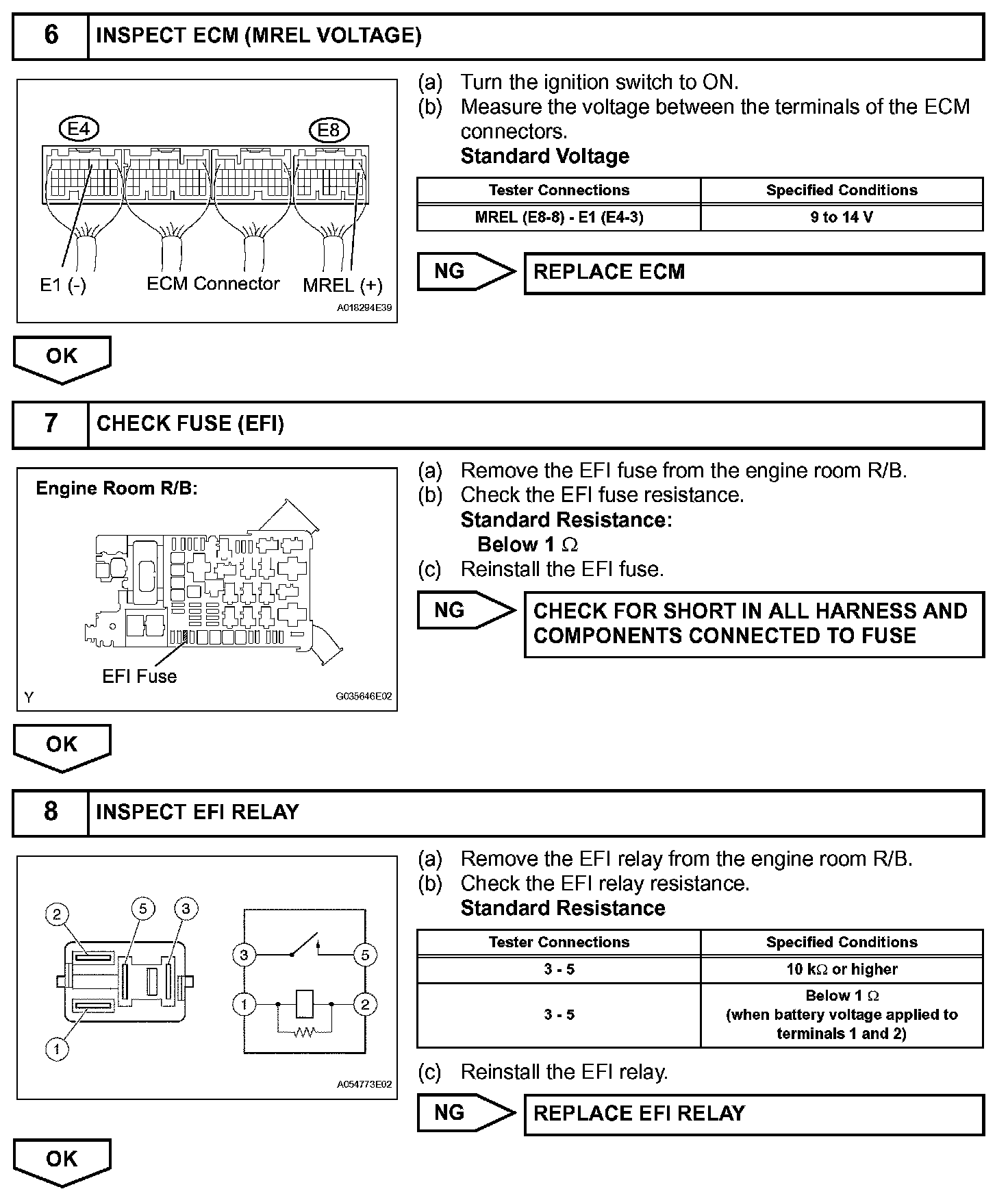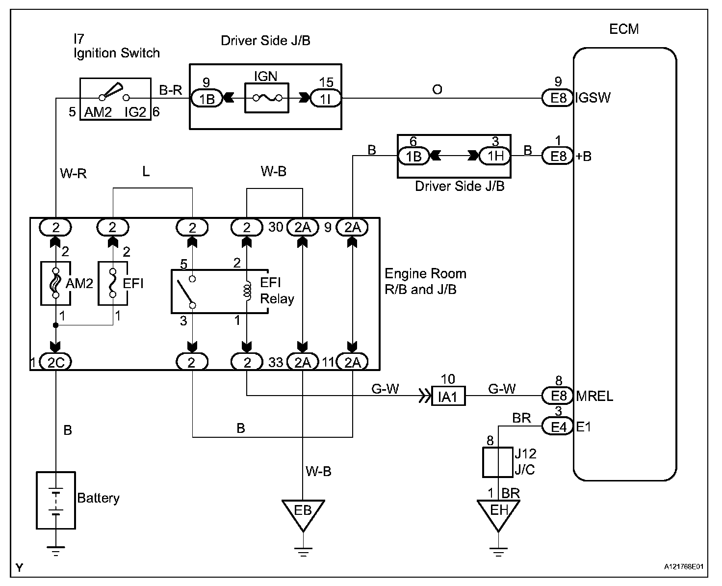When the ignition switch is turned to ON, the battery voltage is applied to terminal IGSW of the ECM. The ECM MREL output signal causes a current to flow to the coil, closing the contacts of the EFI relay and supplying power to terminal +B of the ECM.