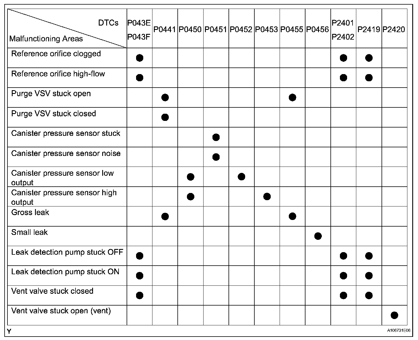 If any EVAP system DTCs are set, the malfunctioning area can be determined using the table given.