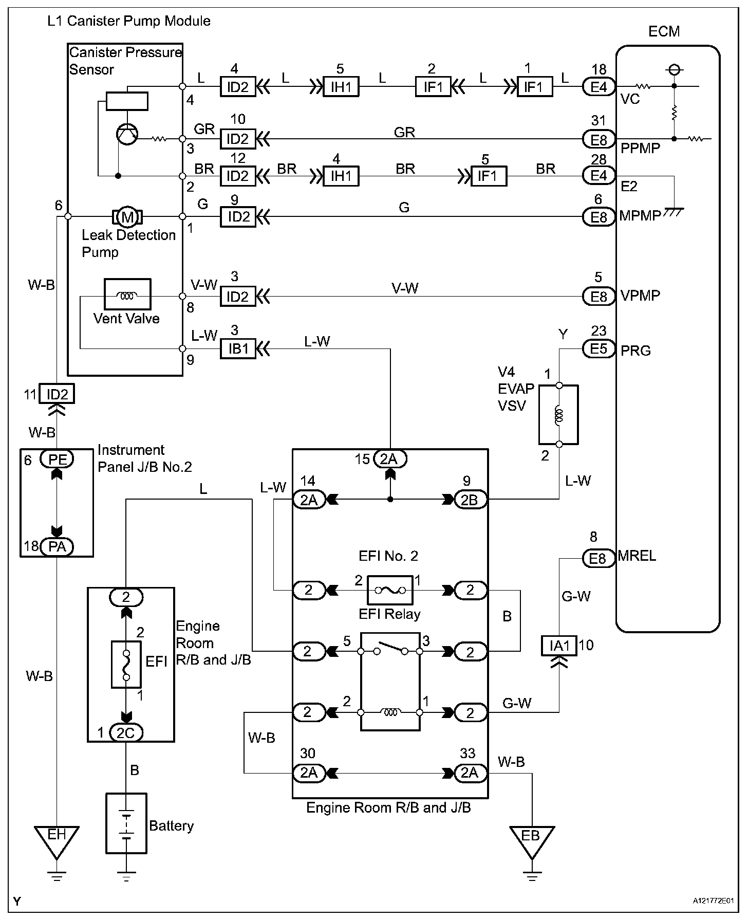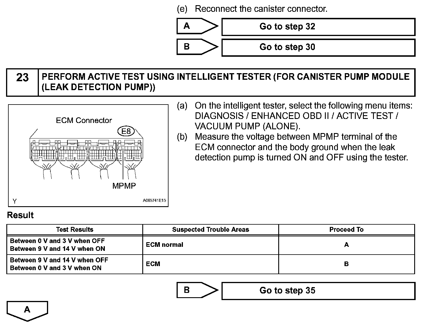 The leak detection pump creates negative pressure (vacuum) in the EVAP system and the pressure is measured. Finally, the ECM monitors for leaks from the EVAP system, and malfunctions in both the canister pump module and purge VSV, based on the EVAP pressure.