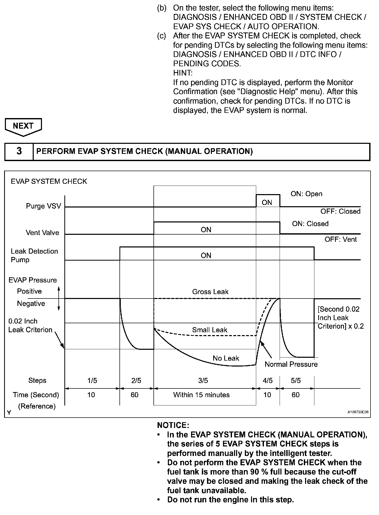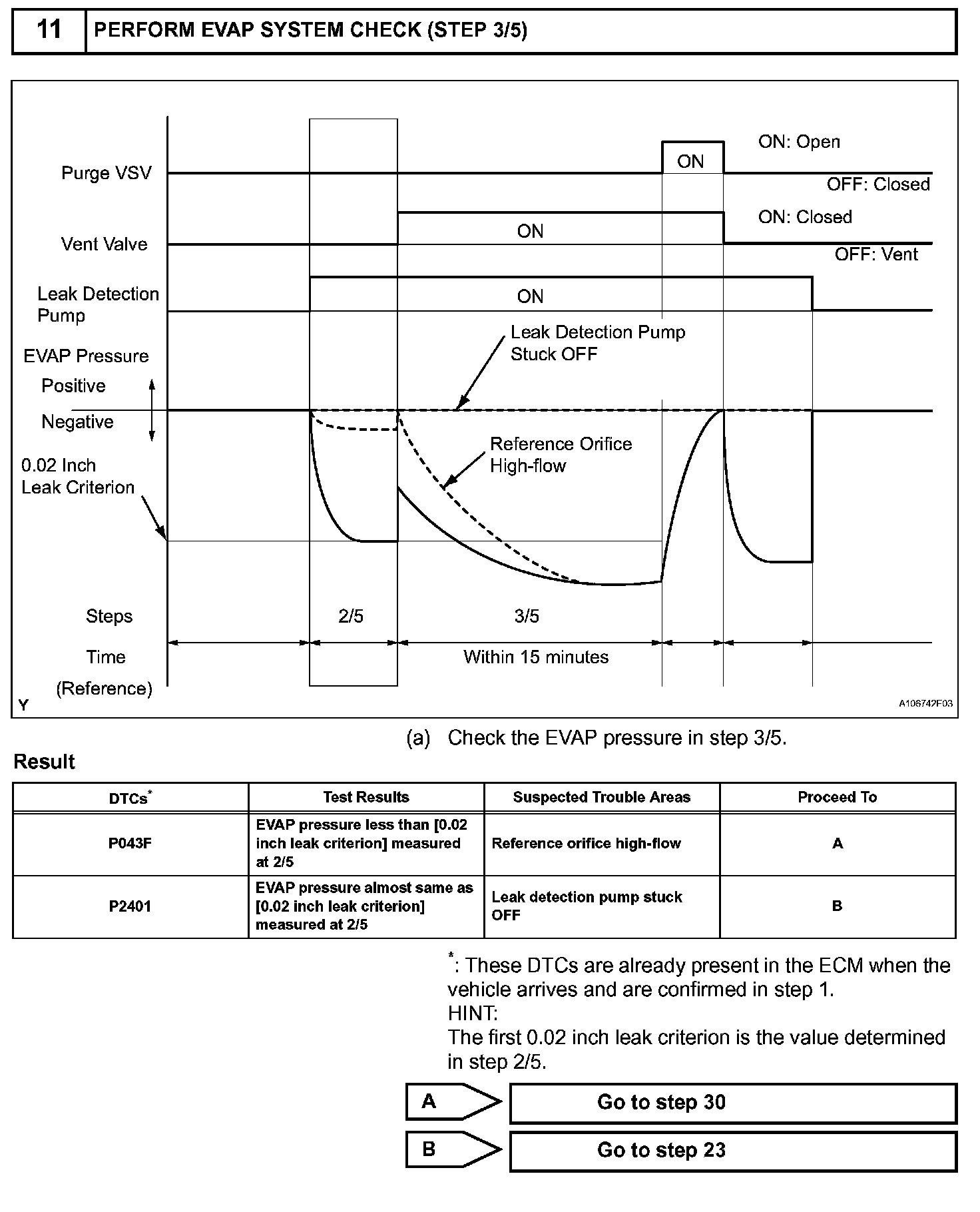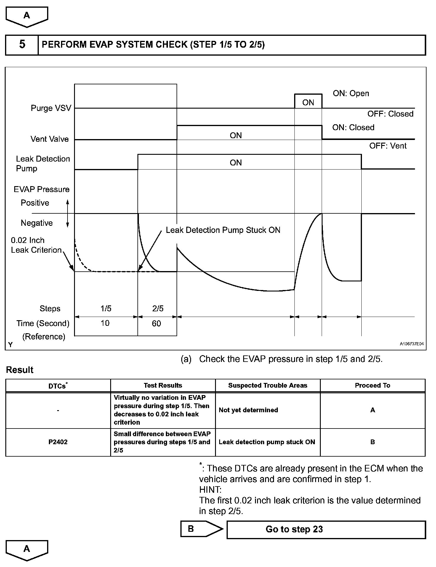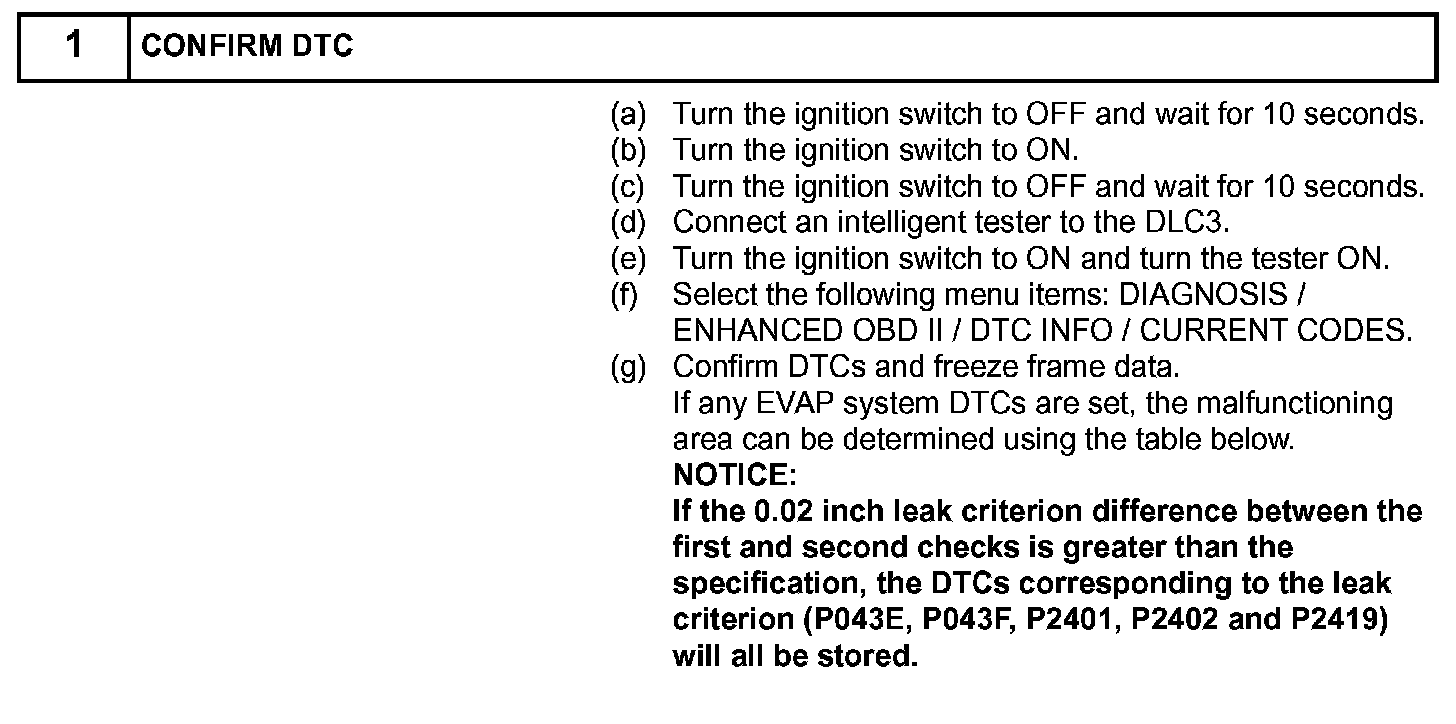 NOTE: If the 0.02 inch leak criterion difference between the first and second checks is greater than the specification, the DTCs corresponding to the leak criterion (P043E, P043F, P2401, P2402 and P2419) will be all stored.