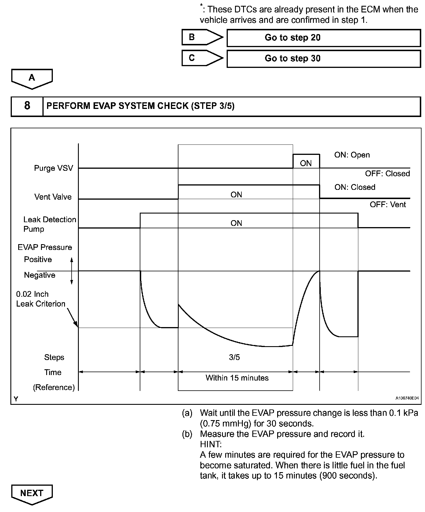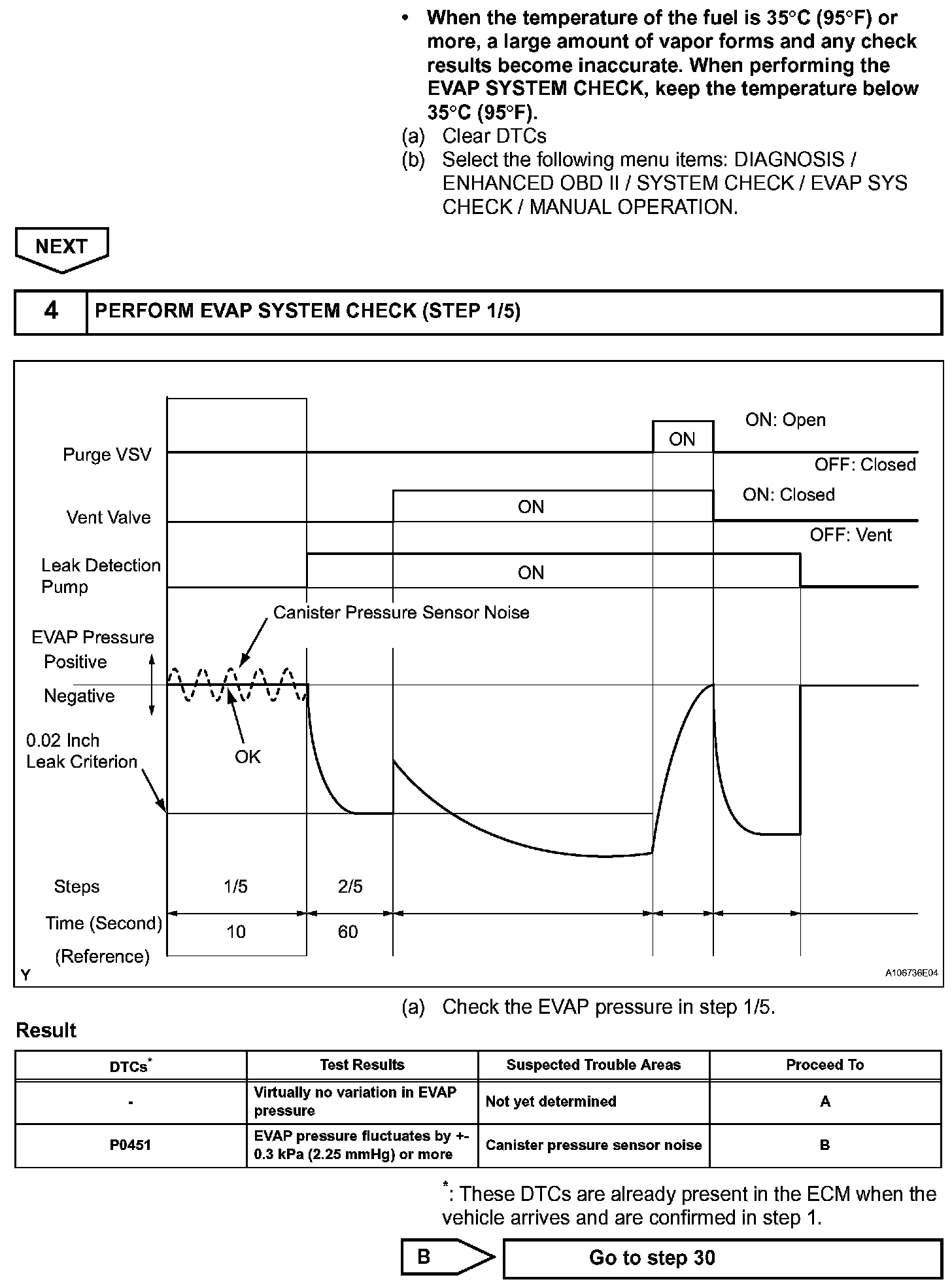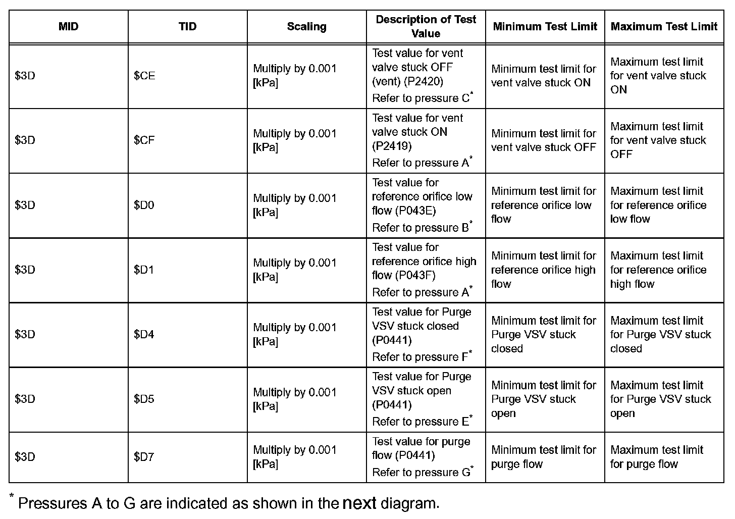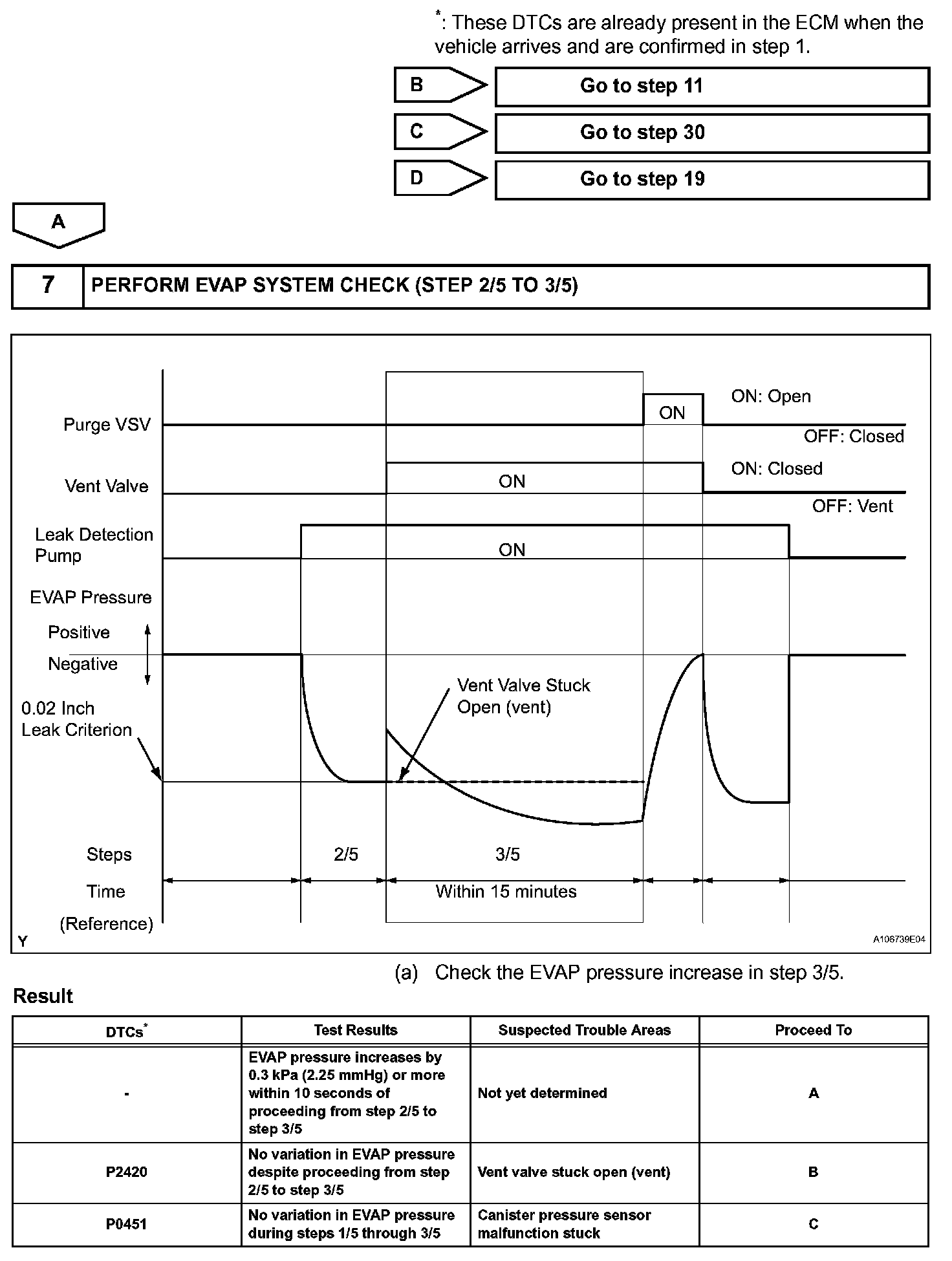 NOTE: If the 0.02 inch leak criterion difference between the first and second checks is greater than the specification, the DTCs corresponding to the leak criterion (P043E, P043F, P2401, P2402 and P2419) will be all stored.