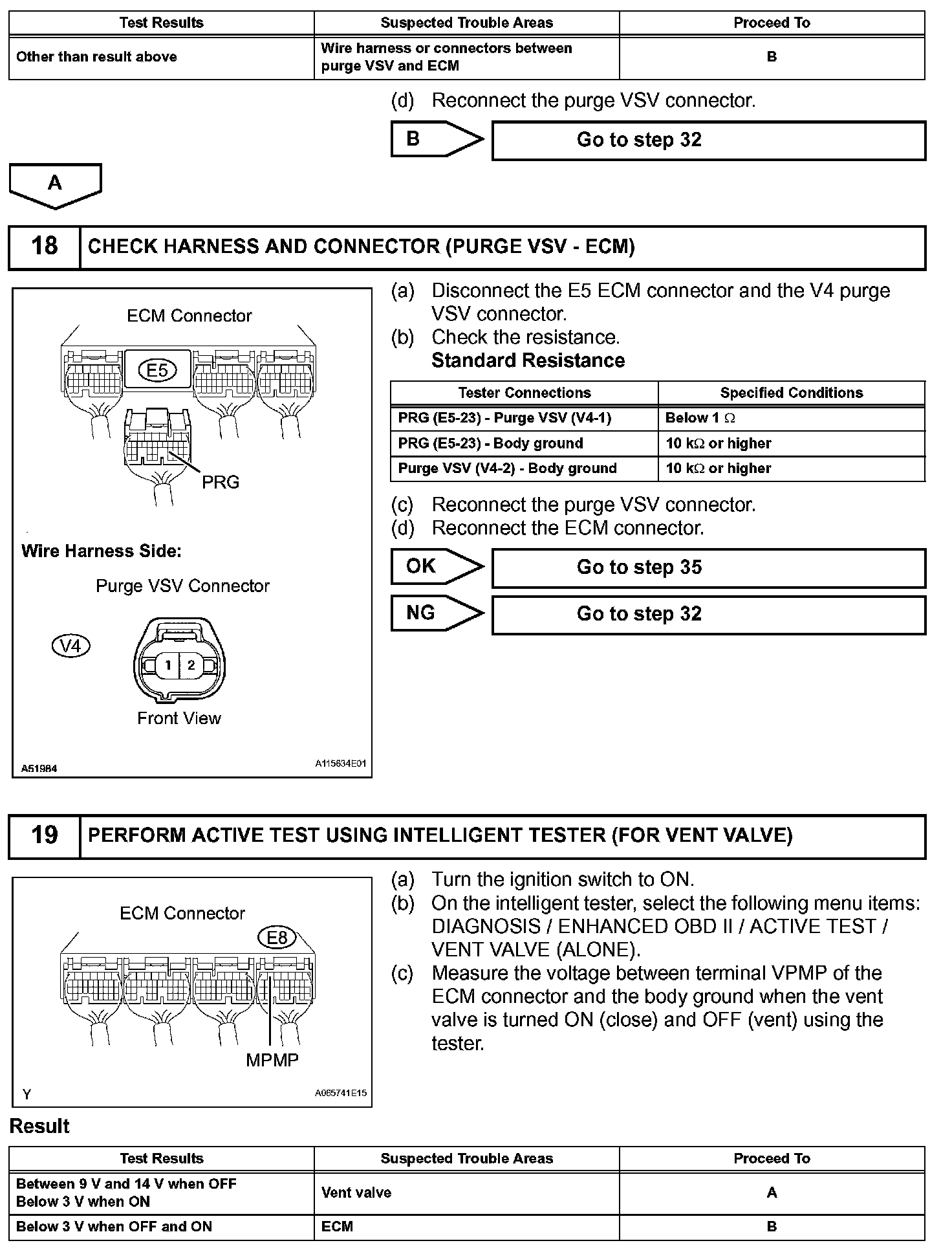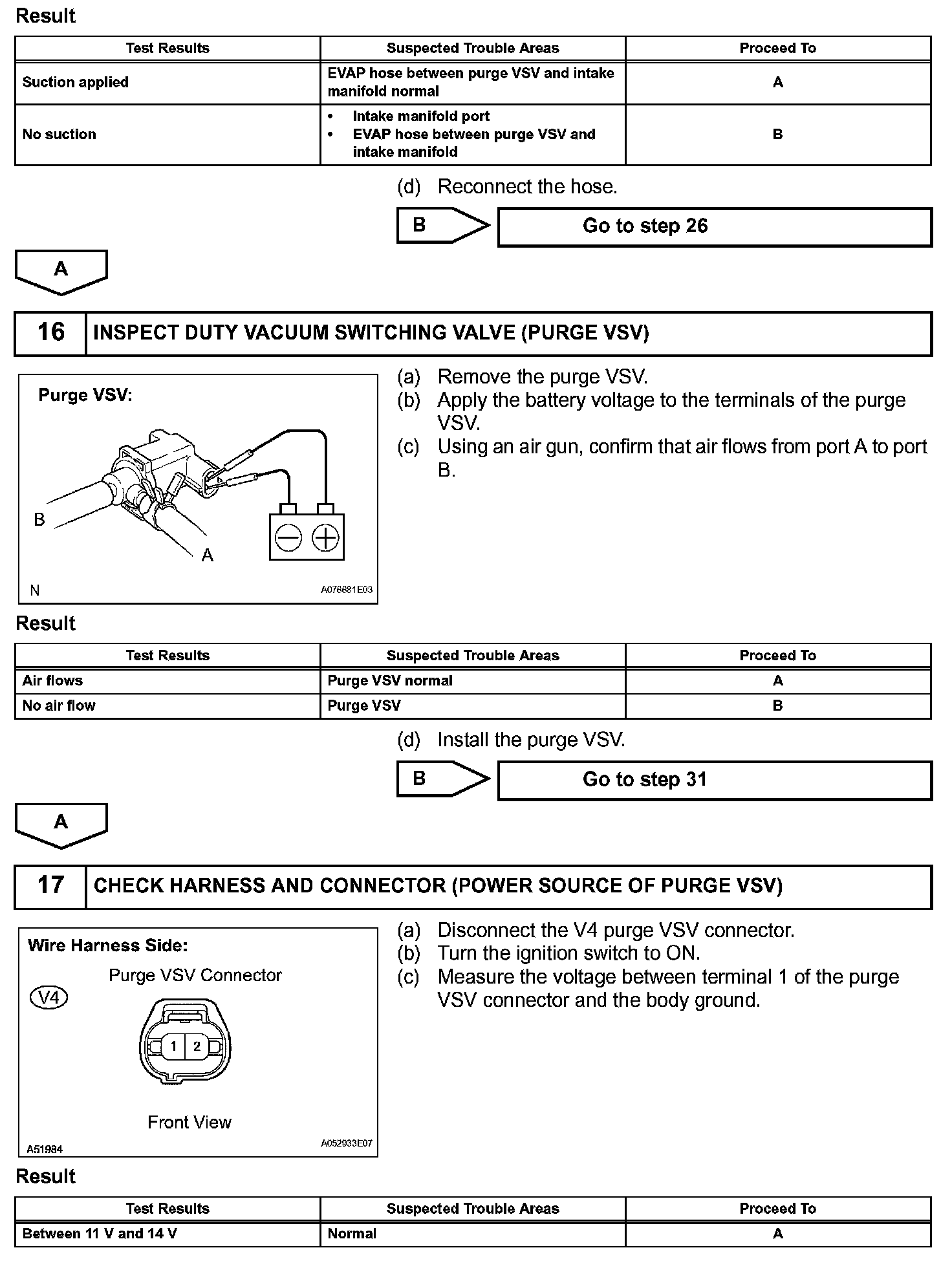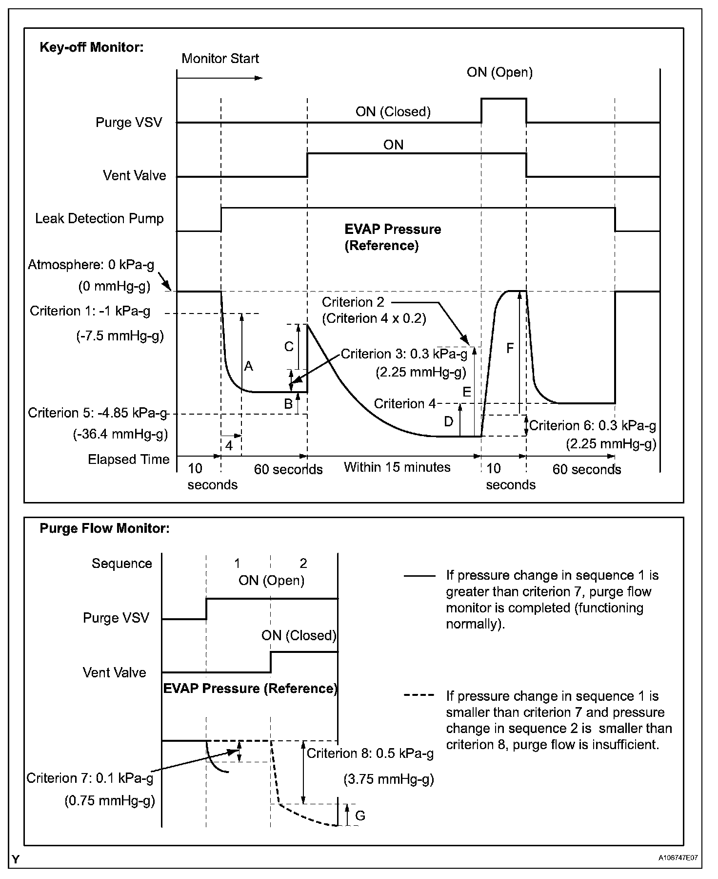 While the engine is running and the purge VSV (Vacuum Switching Valve) is ON (open), the ECM monitors the purge flow by measuring the EVAP pressure change. If negative pressure is not created, the ECM begins the 2nd monitor.