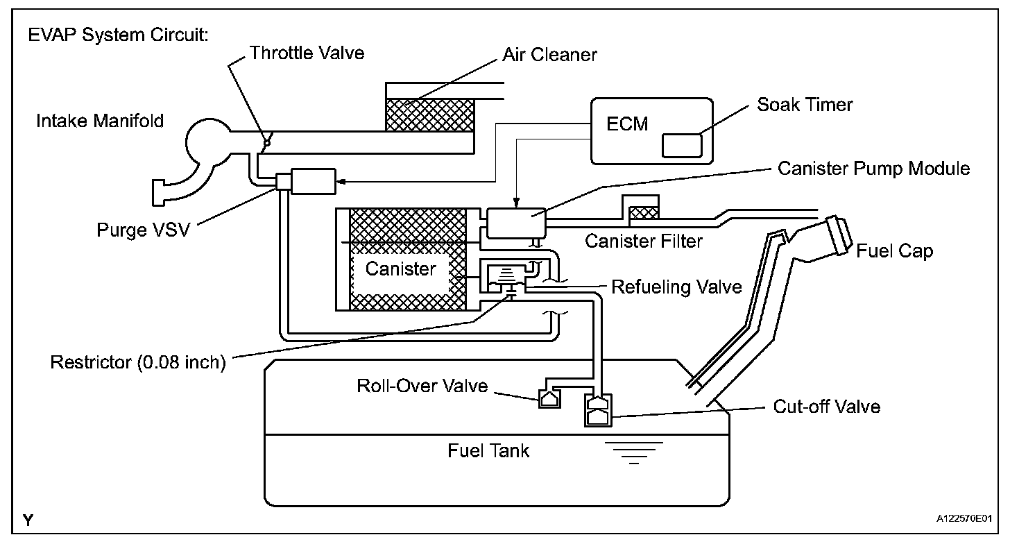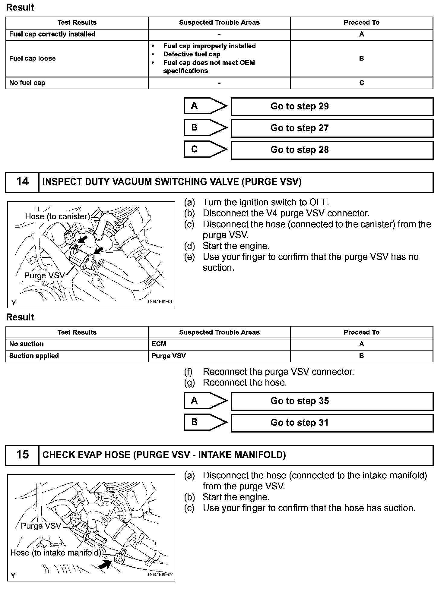 While the engine is running, if a predetermined condition (closed-loop etc.) is met, the purge VSV is opened by the ECM and stored fuel vapors in the canister are purged to the intake manifold. The ECM changes the duty cycle ratio of the purge VSV to control purge flow volume.
