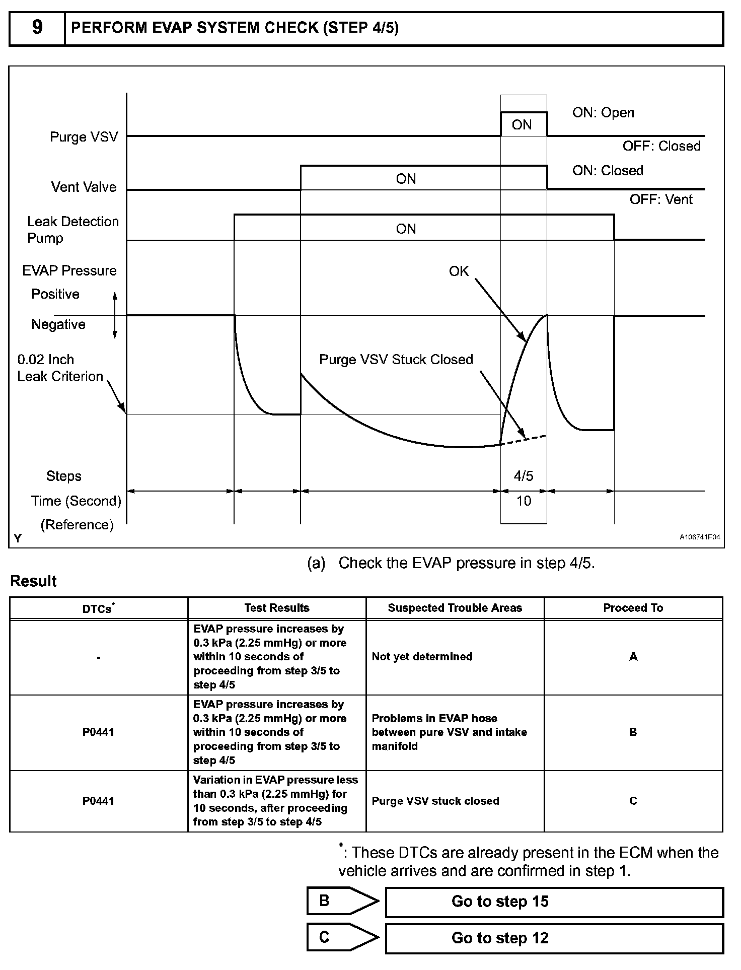 The vent valve is turned OFF (open) and the EVAP pressure is then measured. If the variation in the pressure is less than 0.5 kPa (3.75 mmHg), the ECM interprets this as the purge VSV being stuck closed, and illuminates the MIL and sets DTC P0441 (2 trip detection logic).