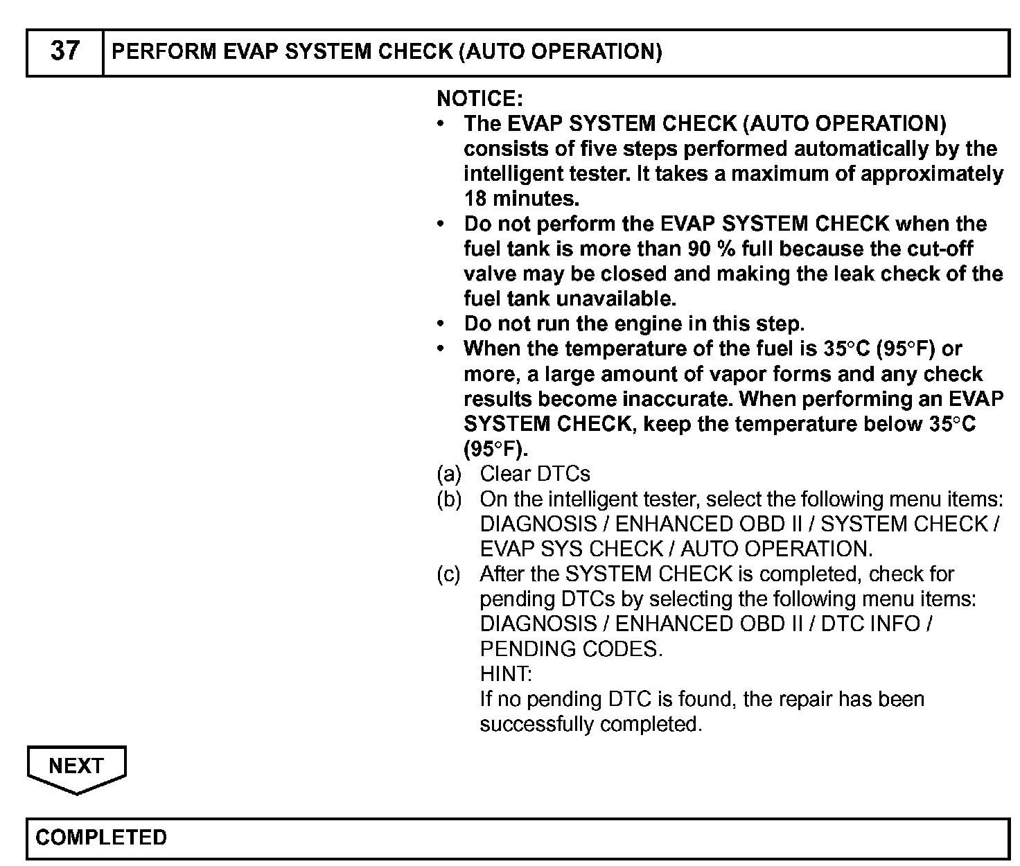 - Using intelligent tester monitor results enables the EVAP (Evaporative Emission) system to be confirmed.