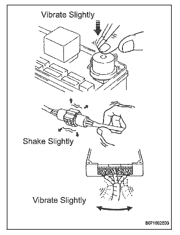 With a problem that only occurs when the engine is cold or as a result of vibration caused by the road during driving, the problem can never be determined if the symptoms are being checked on a stationary vehicle or on a vehicle with a warmed up engine. Vibration, heat or water penetration (moisture) is difficult to reproduce. The symptom simulation tests below are effective substitutes for the conditions and can be applied on a stationary vehicle. Important points in the symptom simulation test: