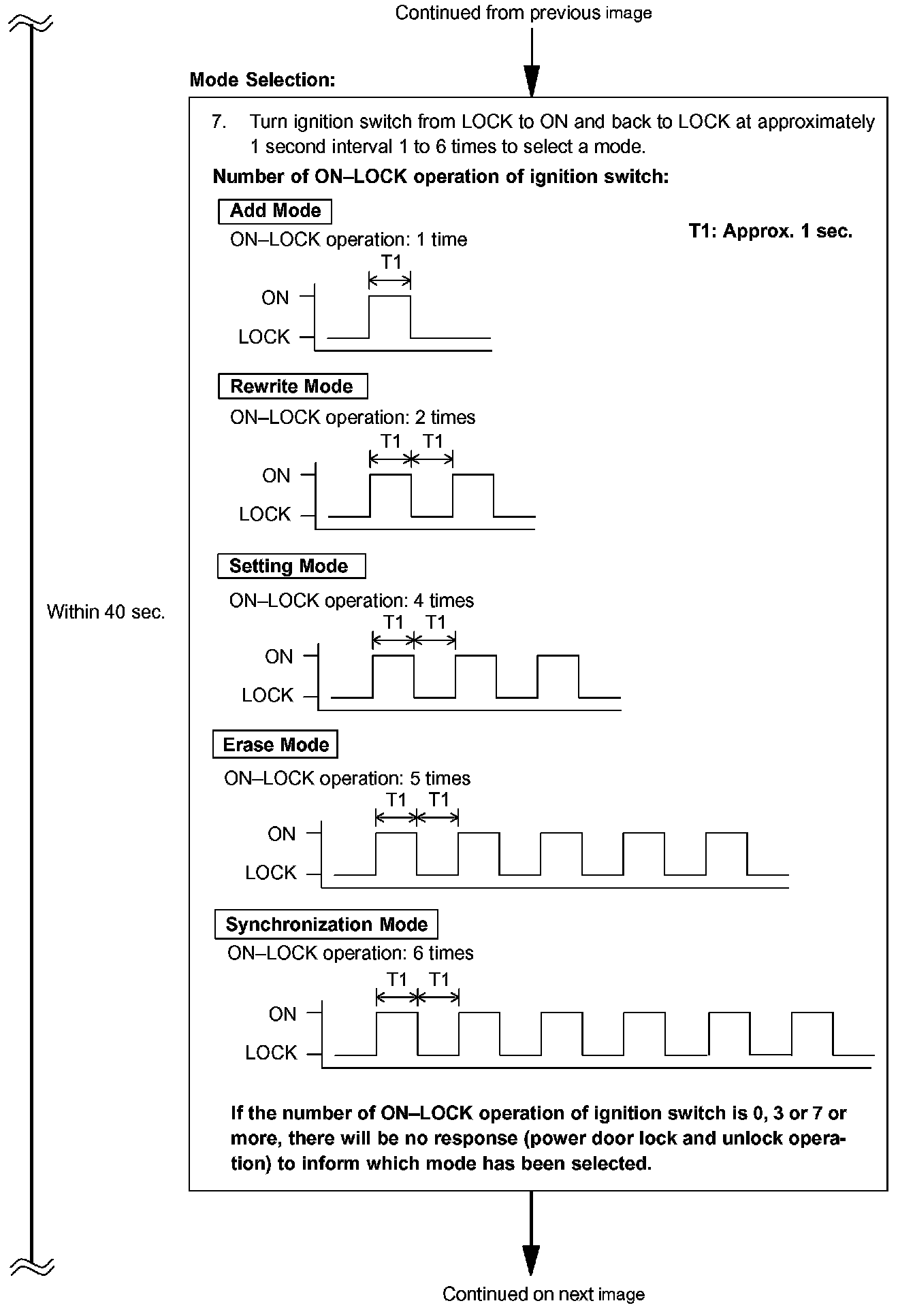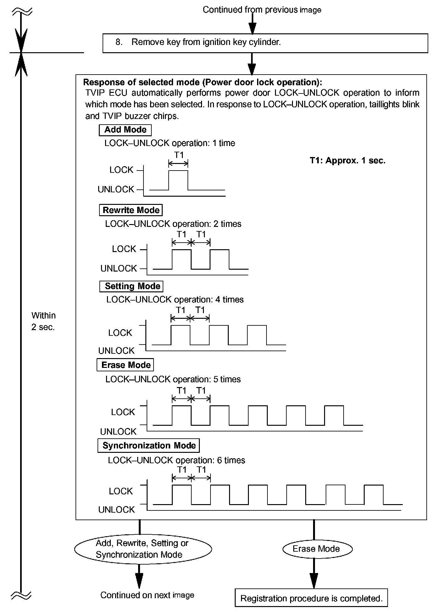 (*1): If a switch on the transmitter is pressed while out of range of the TVIP ECU, the system will not be able to synchronize the sequential code (rolling code) with the registered recognition code. At this time, the system will automatically synchronize them; however automatic synchronization can be performed only 500 times. Therefore, it is necessary to use this mode after they have synchronized 500 times.