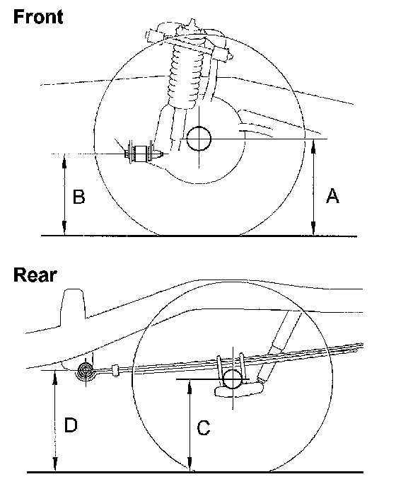 B: Ground clearance of the front adjusting cam bolt center C: Ground clearance of the rear axle shaft center