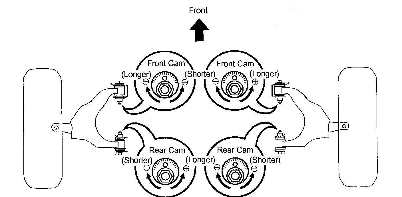 b. Adjust the camber and caster by front and/or rear adjusting cams (See adjustment chart).