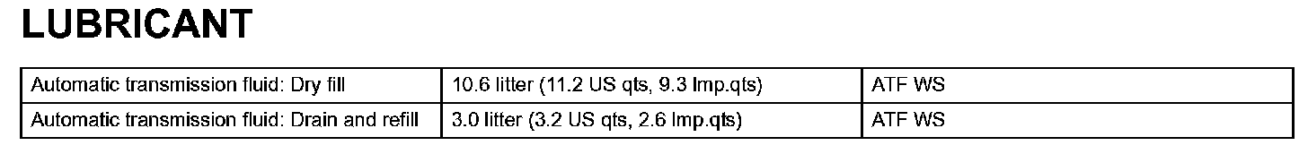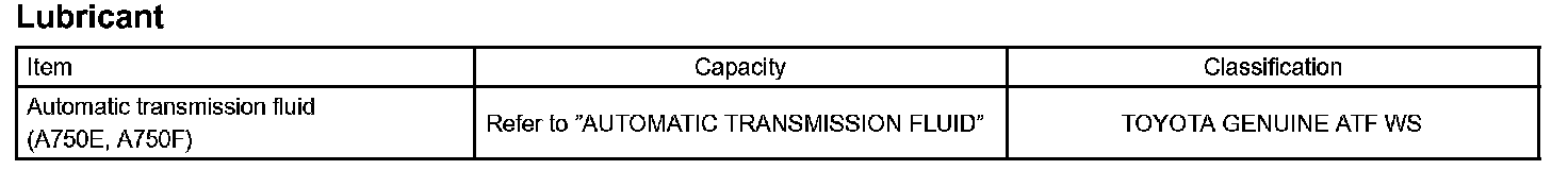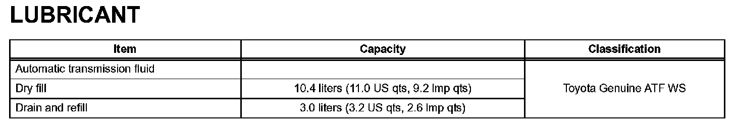 When changing the automatic transmission fluid, use only "Toyota Genuine ATF Type WS" (ATF JWS3324 or NWS9638) to aid in assuring optimum transmission performance.