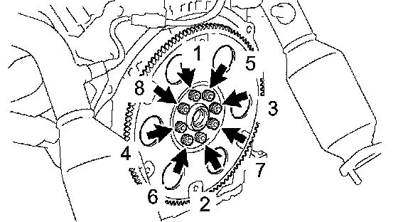 Install and uniformly tighten the 8 mounting bolts in several steps, in the sequence shown in the illustration.