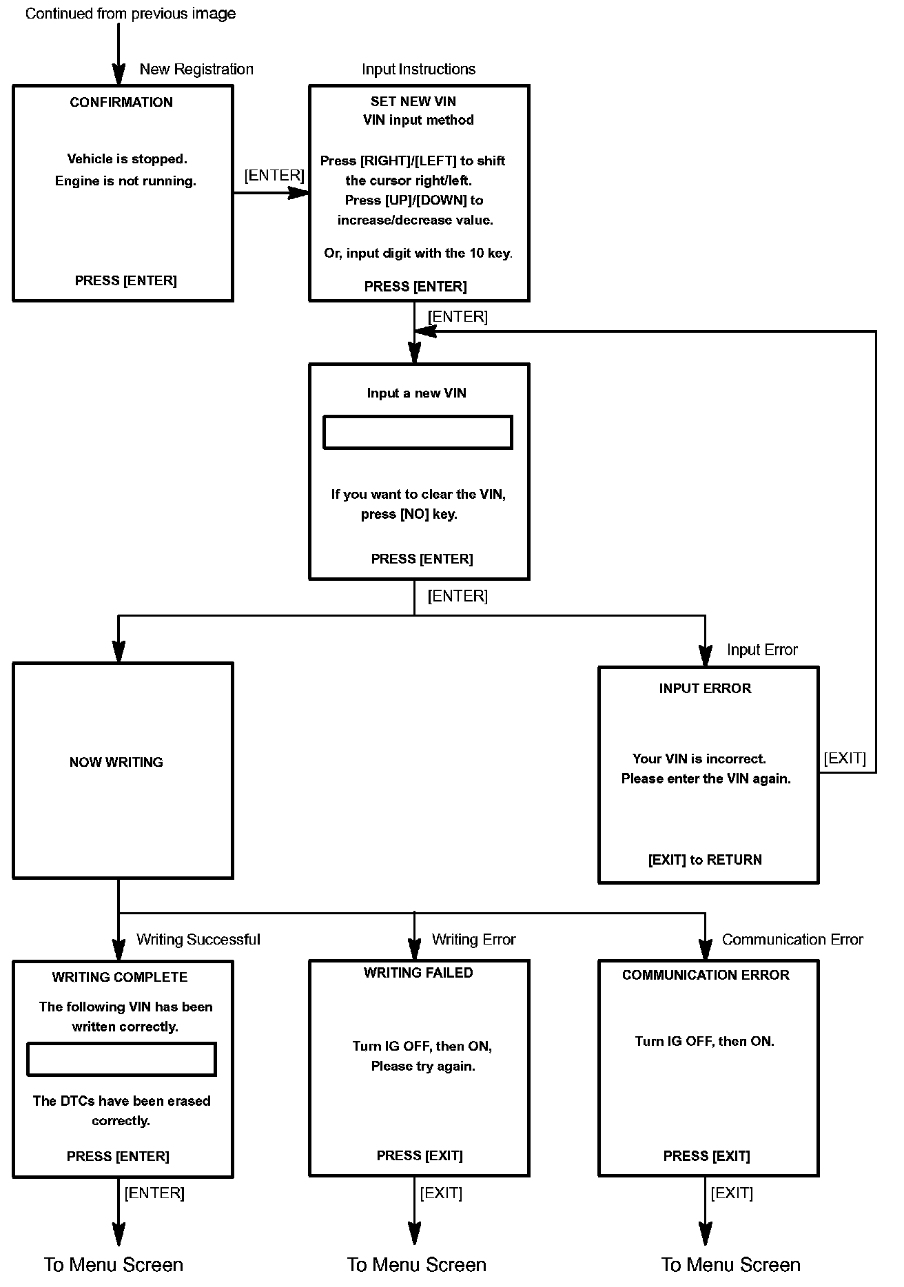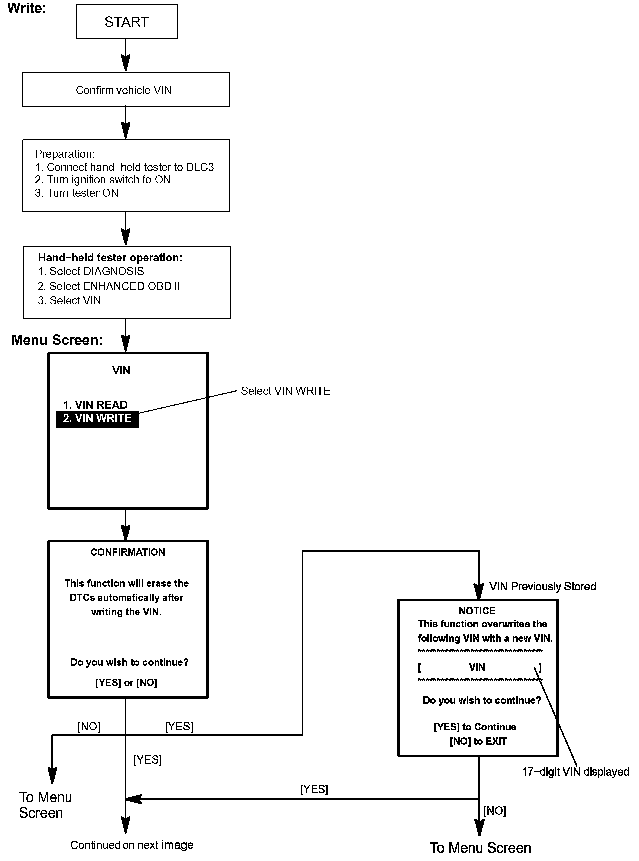 c. Write VIN: Explains the VIN writing process in a flowchart. This process allows the VIN to be input into the ECM. If the ECM is changed, or the VIN and VIN do not match, the VIN can be registered, or overwritten in the ECM by following this procedure.